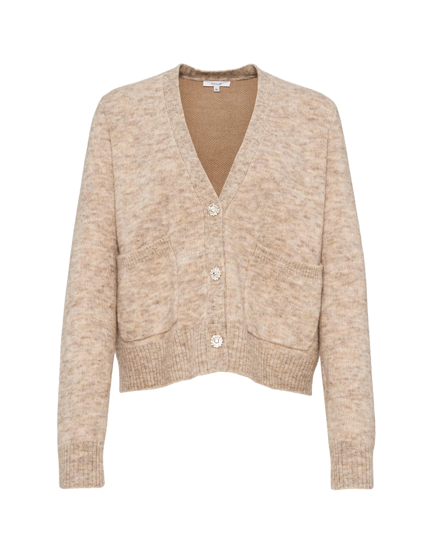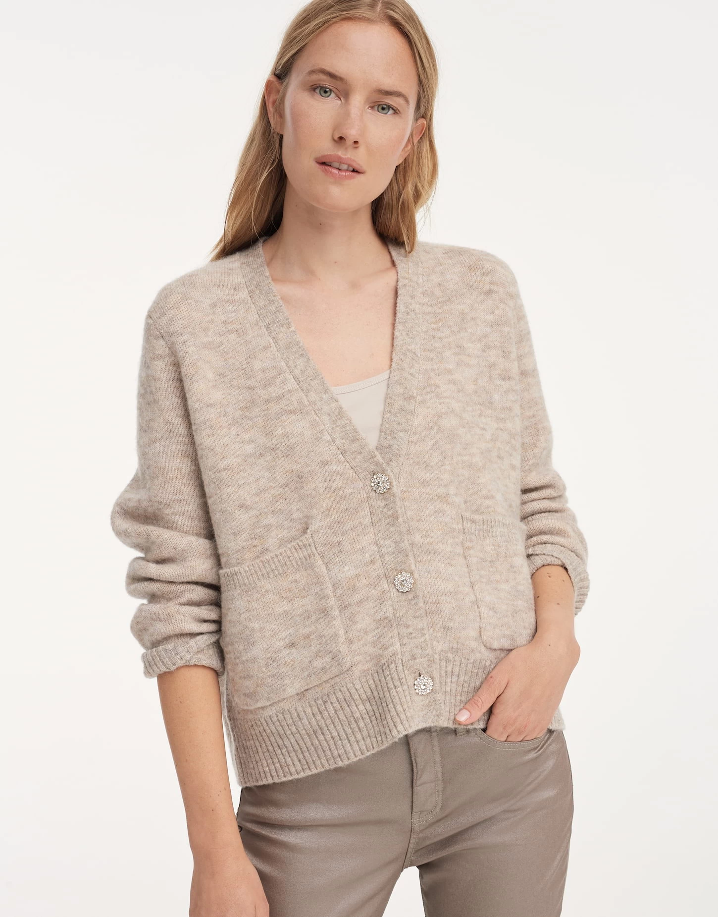Der Cardigan aus nachhaltig recyceltem Polyester spielt mit femininen Details. Die Knöpfe aus Strass verleihen dem clean gehaltenen Design einen festlichen Charakter. Der lässige Look wird durch den weiten Body und den aufgesetzten Taschen abgerundet. Für ein wohliges Tragegefühl sorgt der softe Griff und macht den Cardigan zum perfekten Begleiter für die kalten Tage.