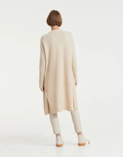 Die Longstrickjacke aus einem Recycled Polyester Mix ist eine vielfältiger Überzieher mit langer Silhouette. Der Schalkragen und die Ärmel am Ende sind gerippt. Kleine Eingrifftaschen auf der Front brechen den puren Look des Cardigans.