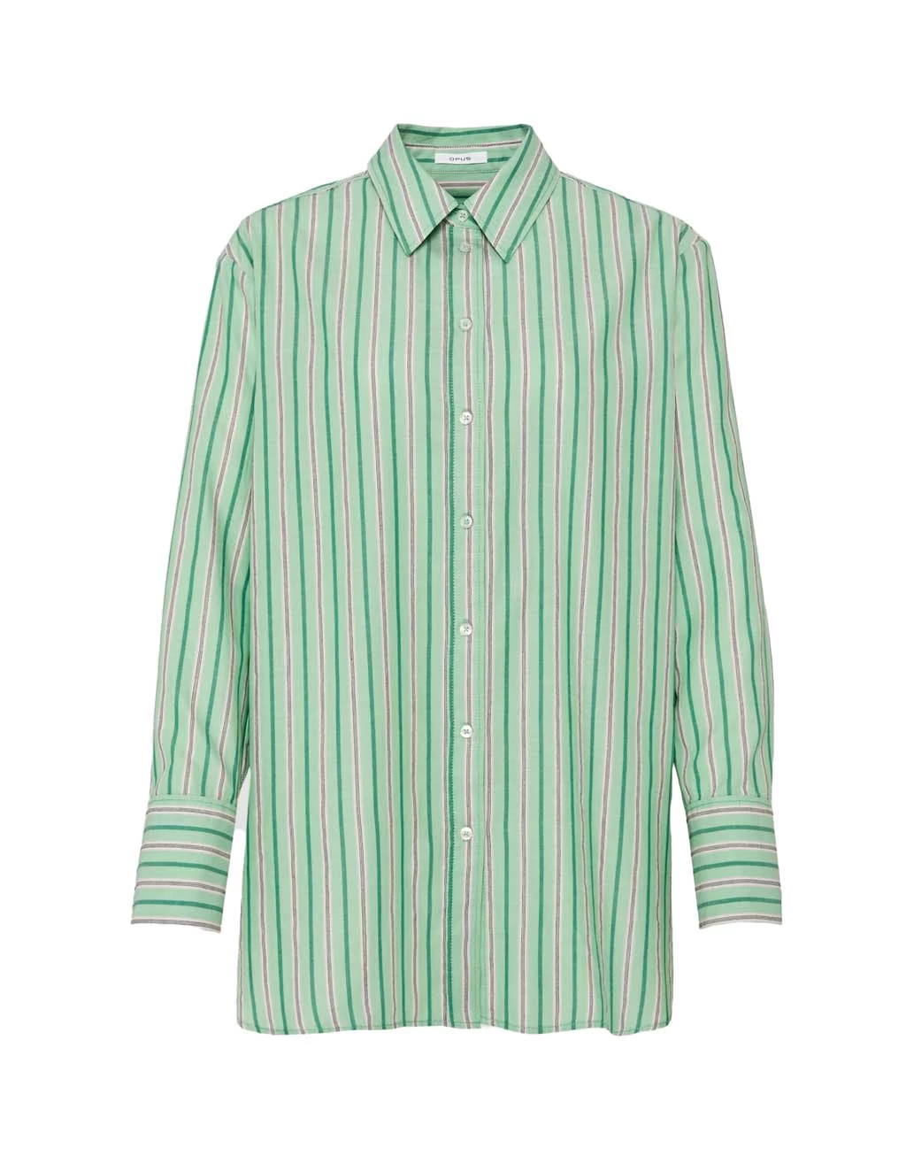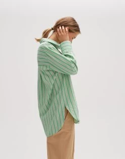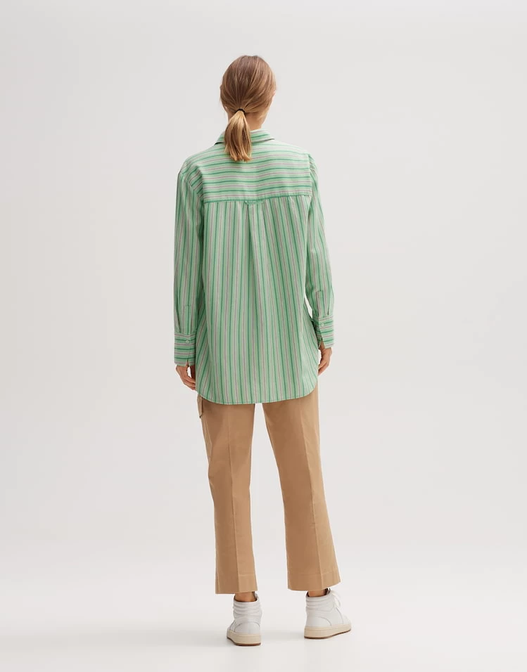 Die Bluse aus hochwertigem BCI Cotton spielt einen Längsstreifen über eine aufgeraute Oberfläche, die wiederum für einen weichen Griff sorgt. Die lange Silhouette endet mit einem abgerundeten Saum.