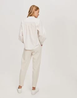 Baumwolle, Stehkragen, V-Neck mit Band zum Binden, weiter Body, voluminöser Arm, Passe mit Raffungen im Rücken für mehr Volumen, das Model ist 176 cm groß und trägt Größe 36