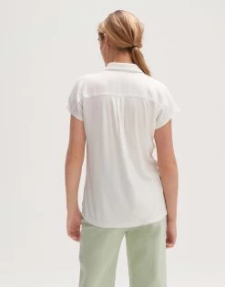 Die Shirtbluse aus einem spannungsreichen Material-Mix besteht im Rücken aus einem soften Viskose-Mix und in der Front aus einer fließenden Blusen-Ware. Der Kragen läuft in der Front in einen sommerlichen V-Ausschnitt über.