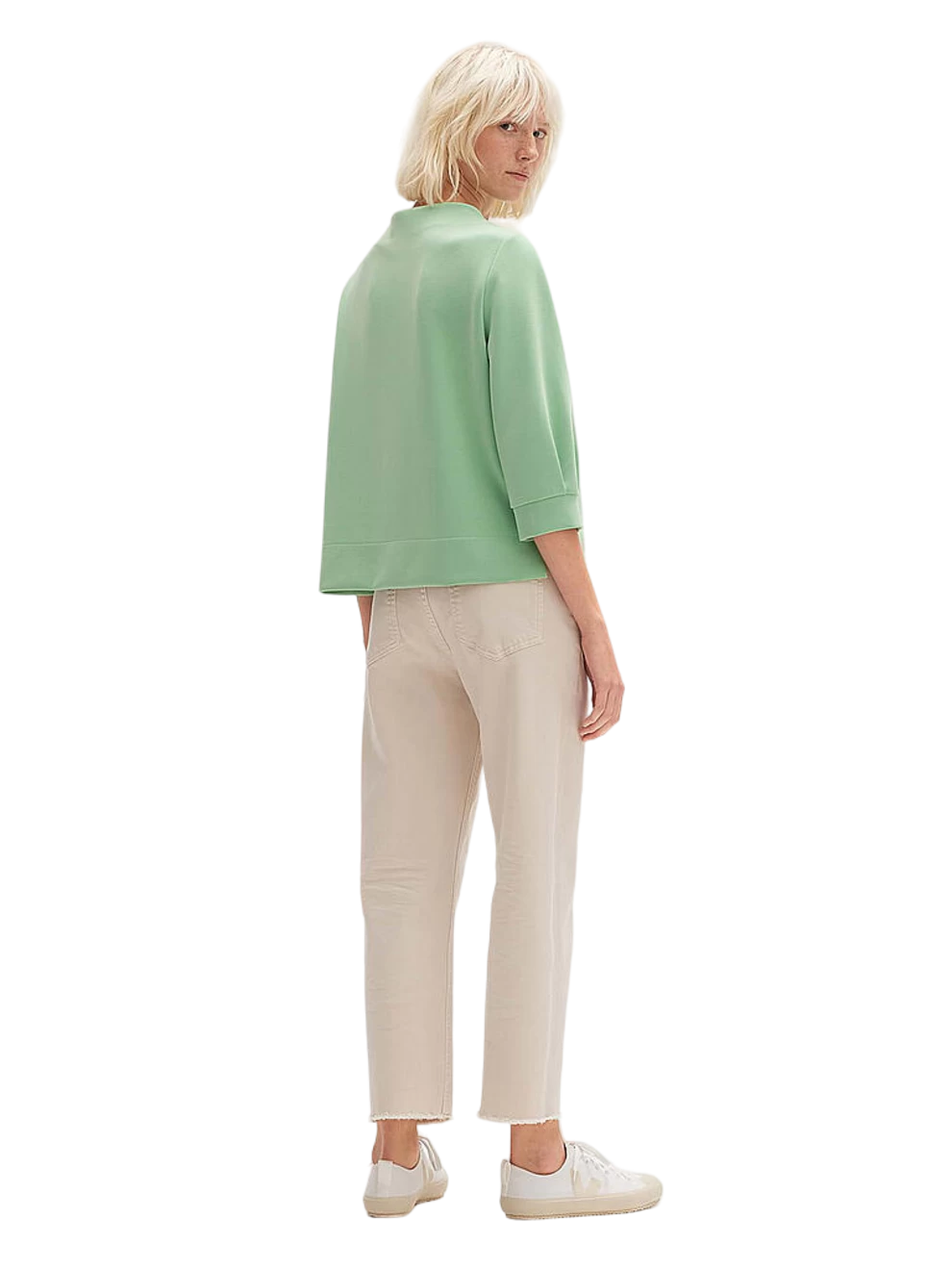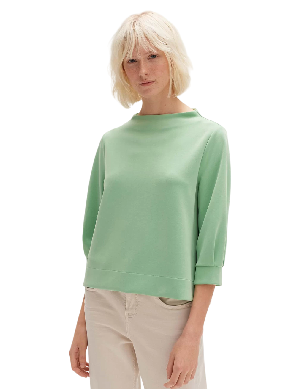 Der Sweater aus einem soften Modal-Mix besticht mit raffinierten Details. Der weite, verkürzte Arm wird in der Manschette drapiert und ein kleiner Stehkragen sorgt für einen eleganten Look. Ein Versatz im Saum kommt durch die Schlitze in den Seiten wunderschön zur Geltung.
