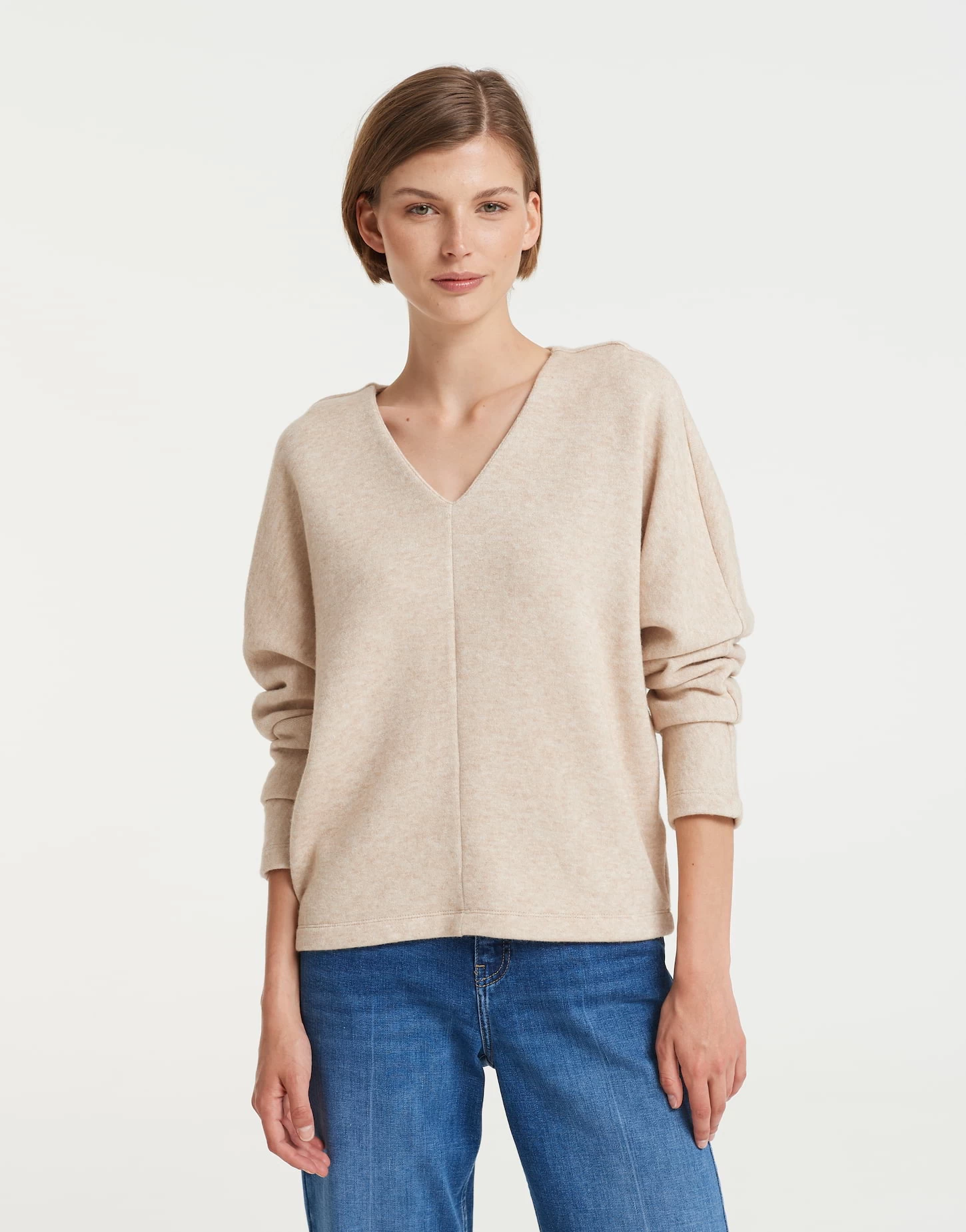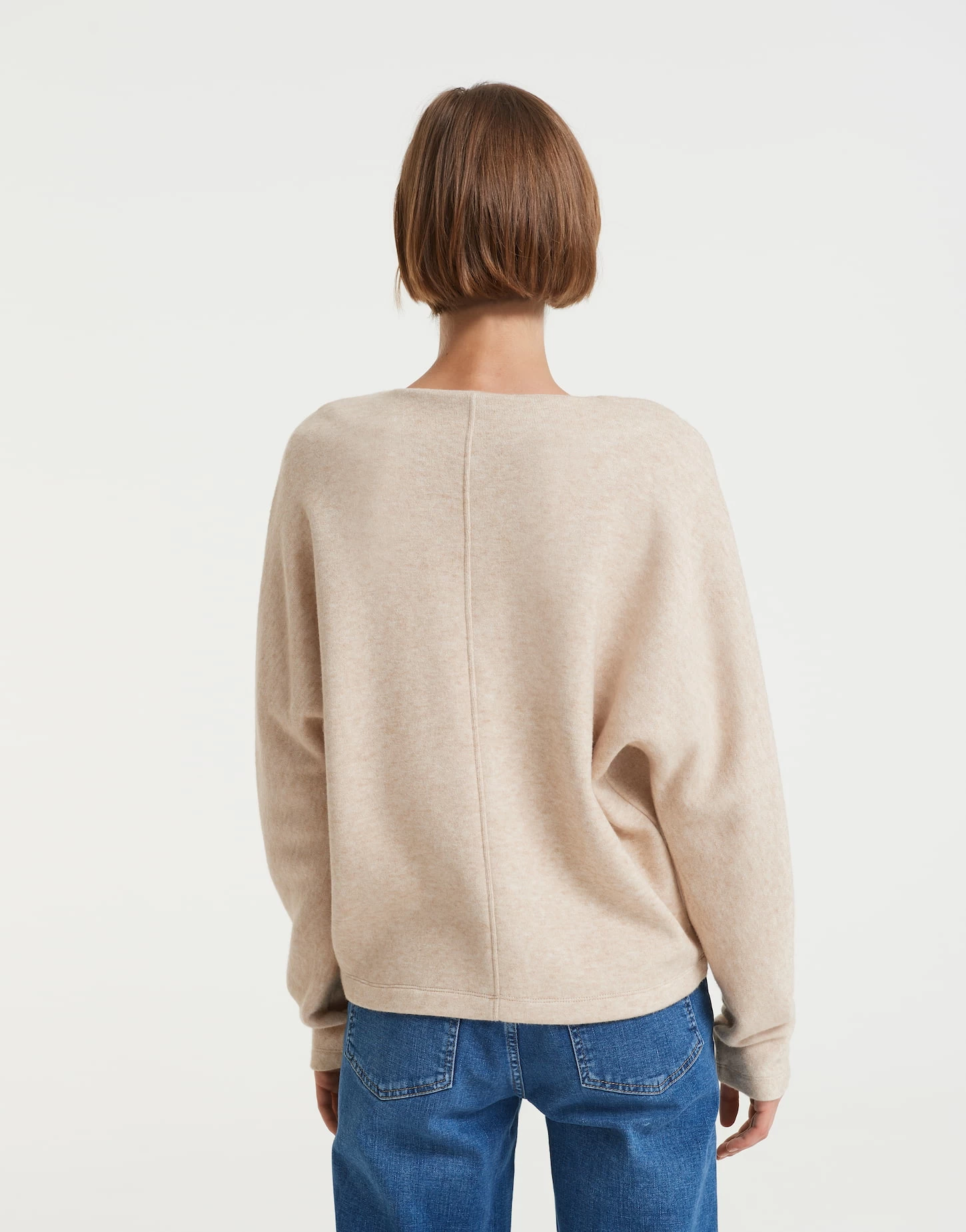 Der Sweater aus einem Viskose-Mix überzeugt mit moderner Silhouette und schöner Strick-Optik. Der weite Body läuft fließend in die Fledermausärmel über. Ein V-Neck rundet den Look ab und eignet sich perfekt zum Layern.