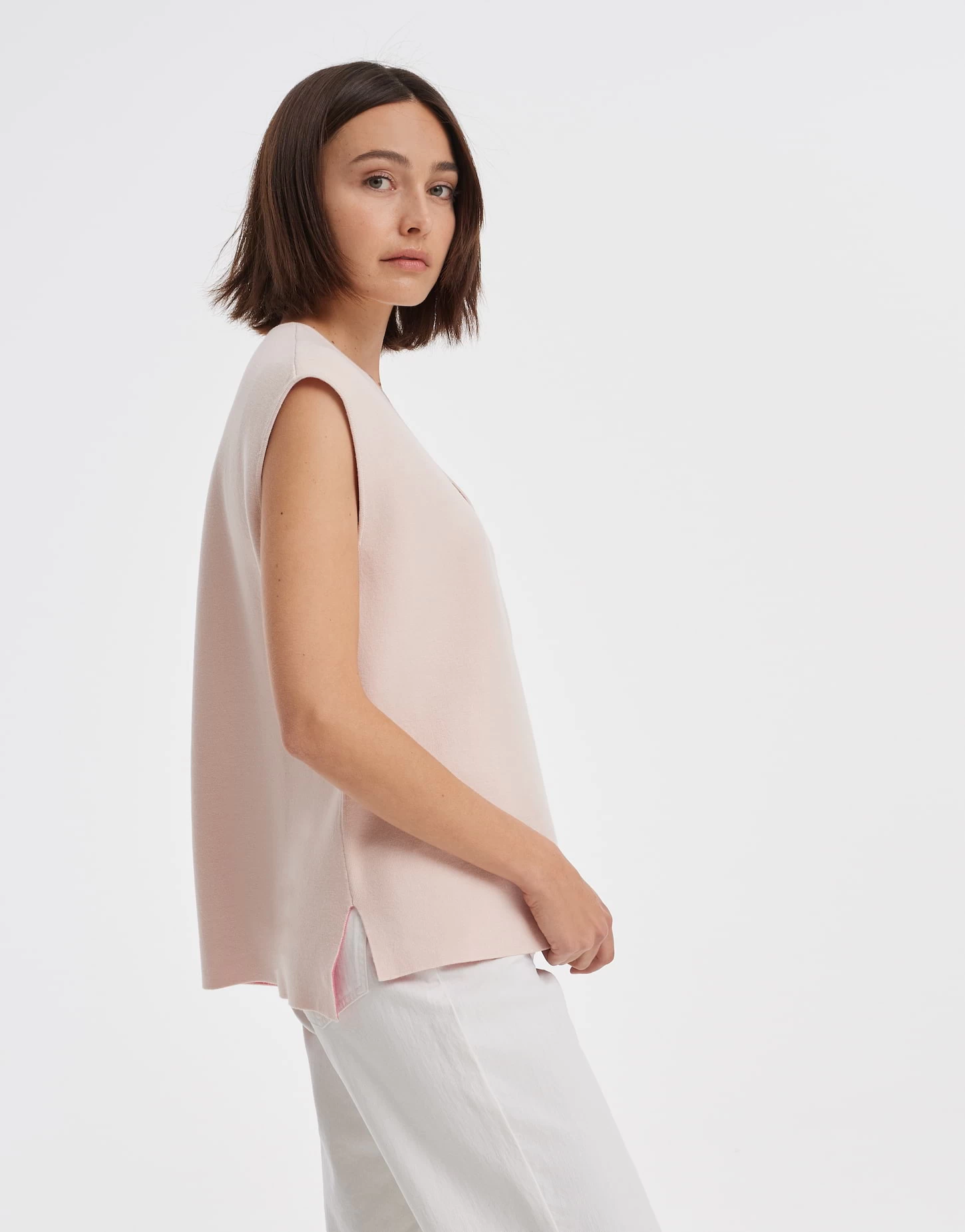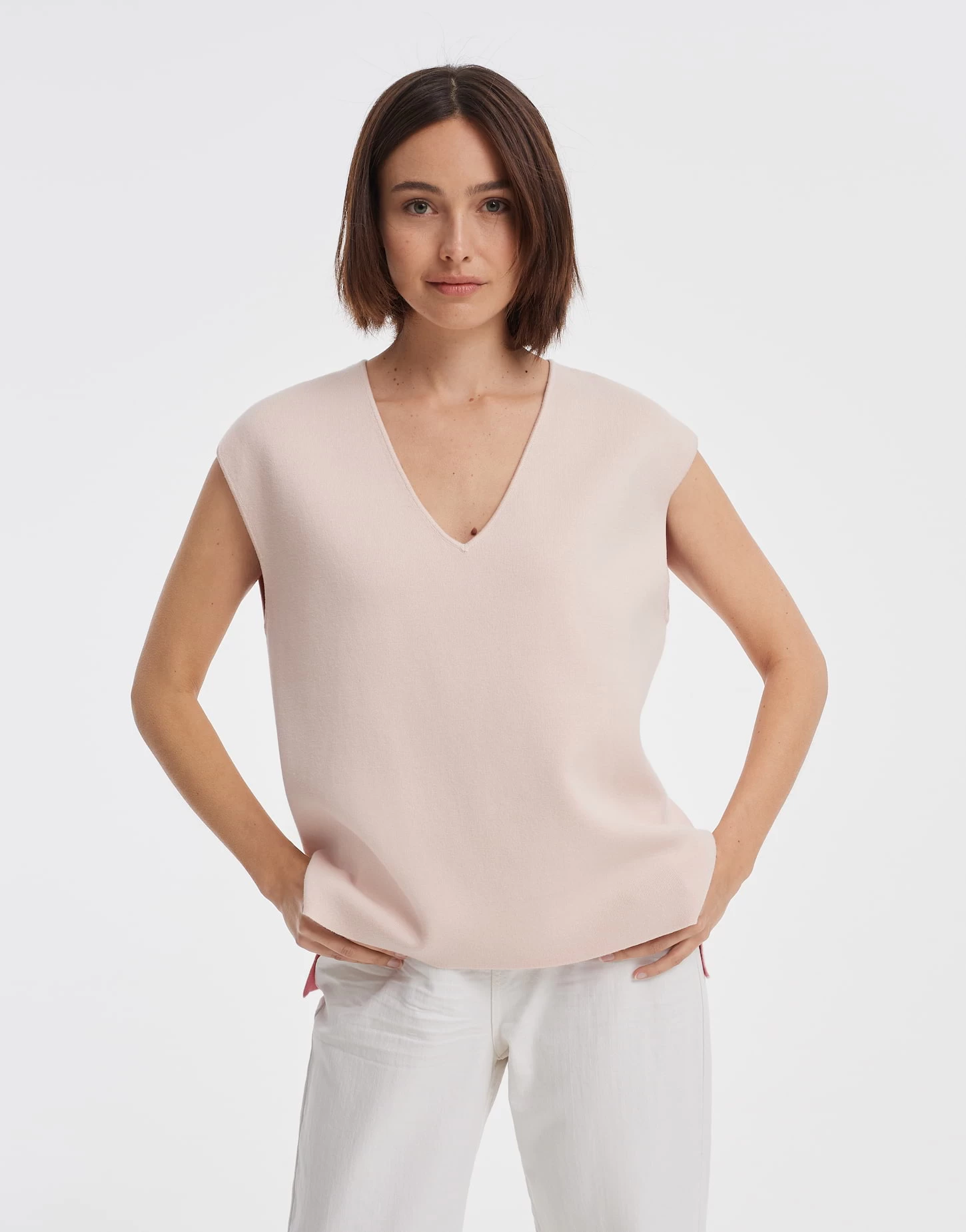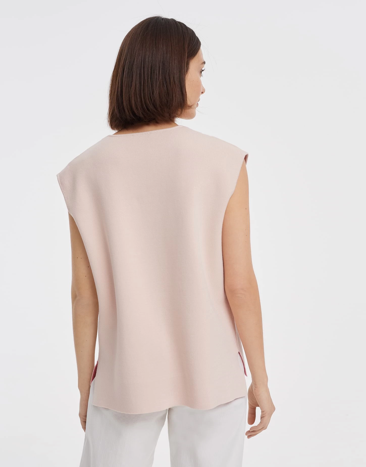 Der Pullunder aus der Mindful Kollektion spielt mit einer raffinierten Zweifarbigkeit. So setzt sich die Innenseite farblich von der AuĂźenseite ab. Der cleane, feine Milano-Strick setzt den Fokus auf die Two-Color-Optik.