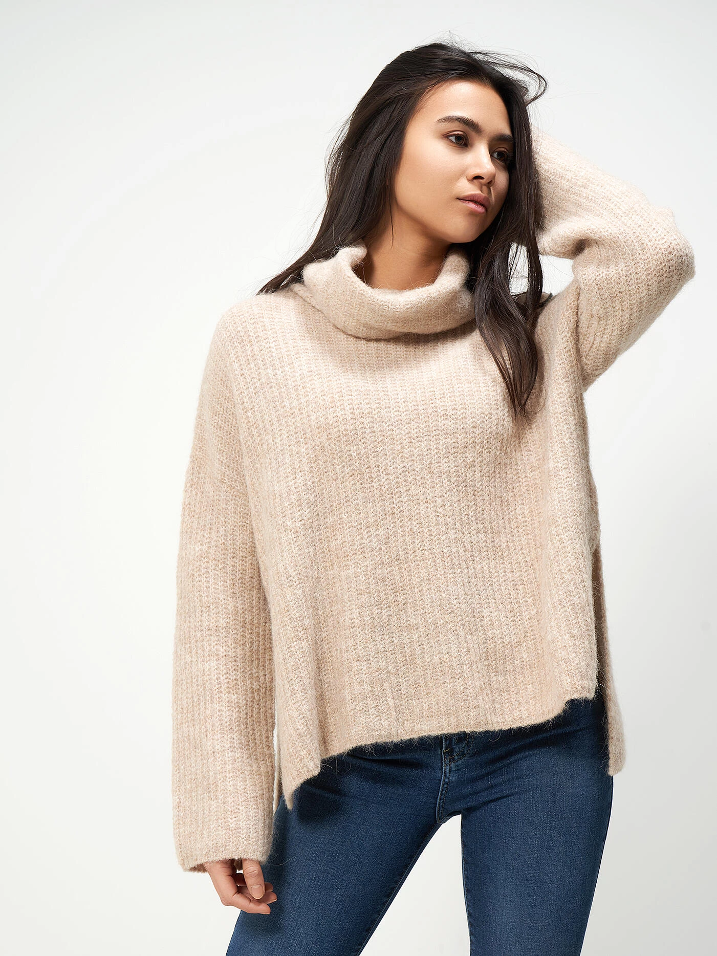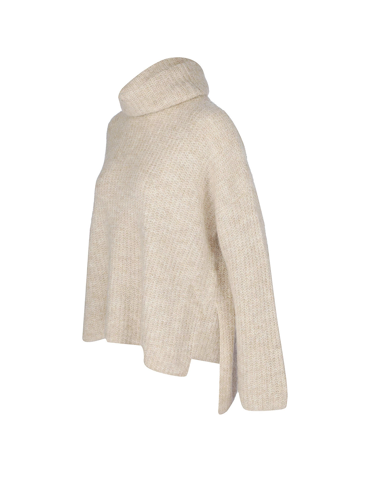Der super softe Pullover überzeugt durch den hochwertigen Materialmix aus Alpaka und Wolle. Die lockere Form ergänzt das weiche Material und sorgt für ein wohliges Tragegefühl. Durch den weiten Body und die überschnittene Schulter wird dem Rollkragenpullover ein oversize Charakter verliehen. Eine leicht verlängerte Rückseite wird durch einen Schlitz an den Seiten betont und rundet den Look ab.