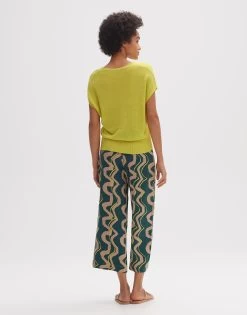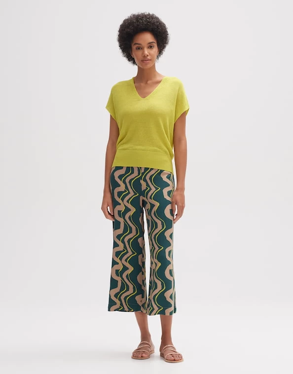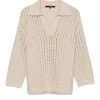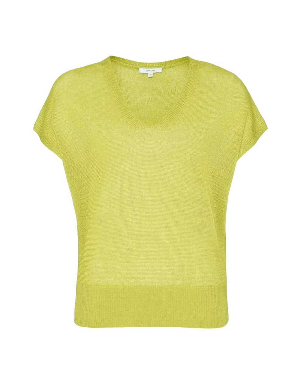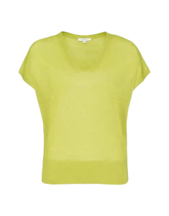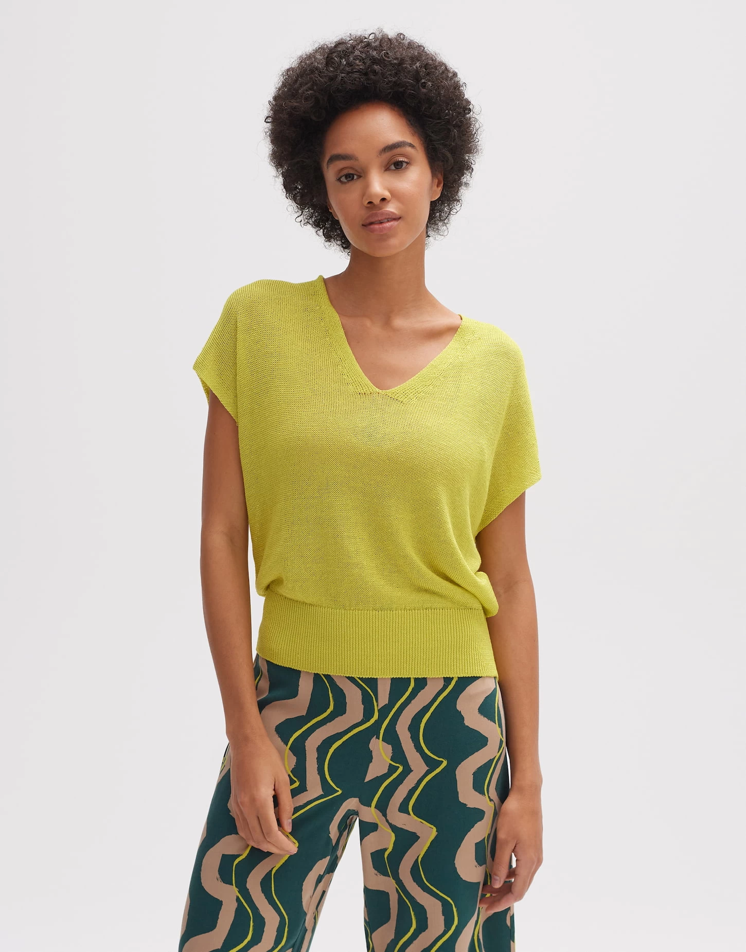 Das Strickshirt aus einem Leinen-Viskose-Mix erhält durch die locker gestrickte Masche eine sommerliche Transparenz. Der tiefe V-Ausschnitt wirkt feminin, während der breite Bund die weite Form locker fallen lässt.