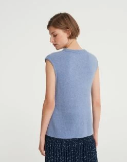 Der Pullunder aus einem melangierten Woll-Mix zeigt sich zeitlos und vielfältig. Der lange Schlitz im breiten Bund sorgt für einen sommerlichen Touch.