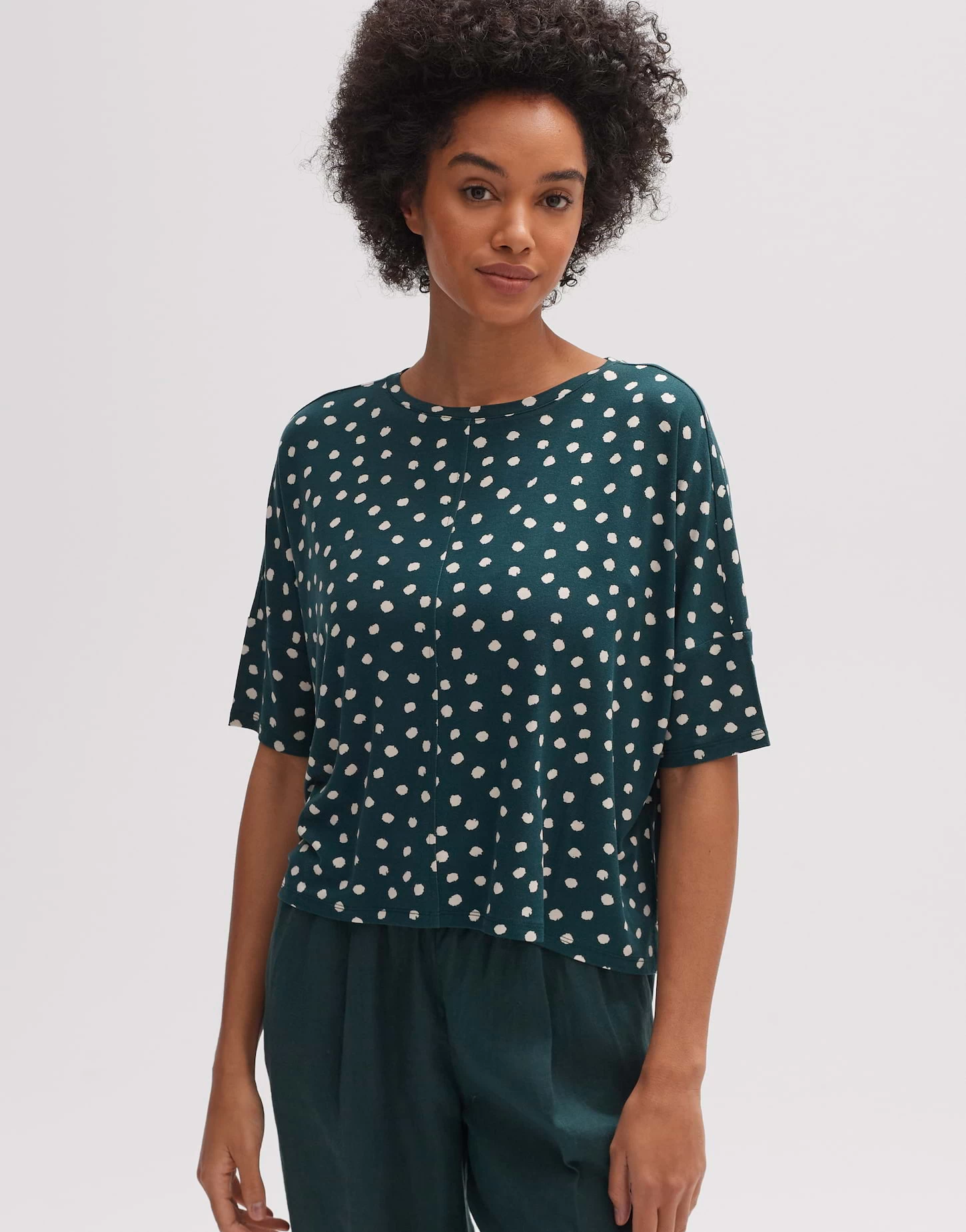 Das Shirt aus einem nachhaltigen ECOVERO™ Viskose-Mix erstrahlt im All-Over-Print mit feinen Punkten. Das unkomplizierte Shirt besitzt einen lockeren, entspannten Fit und ist somit sehr willkommen für warme Sommertage.