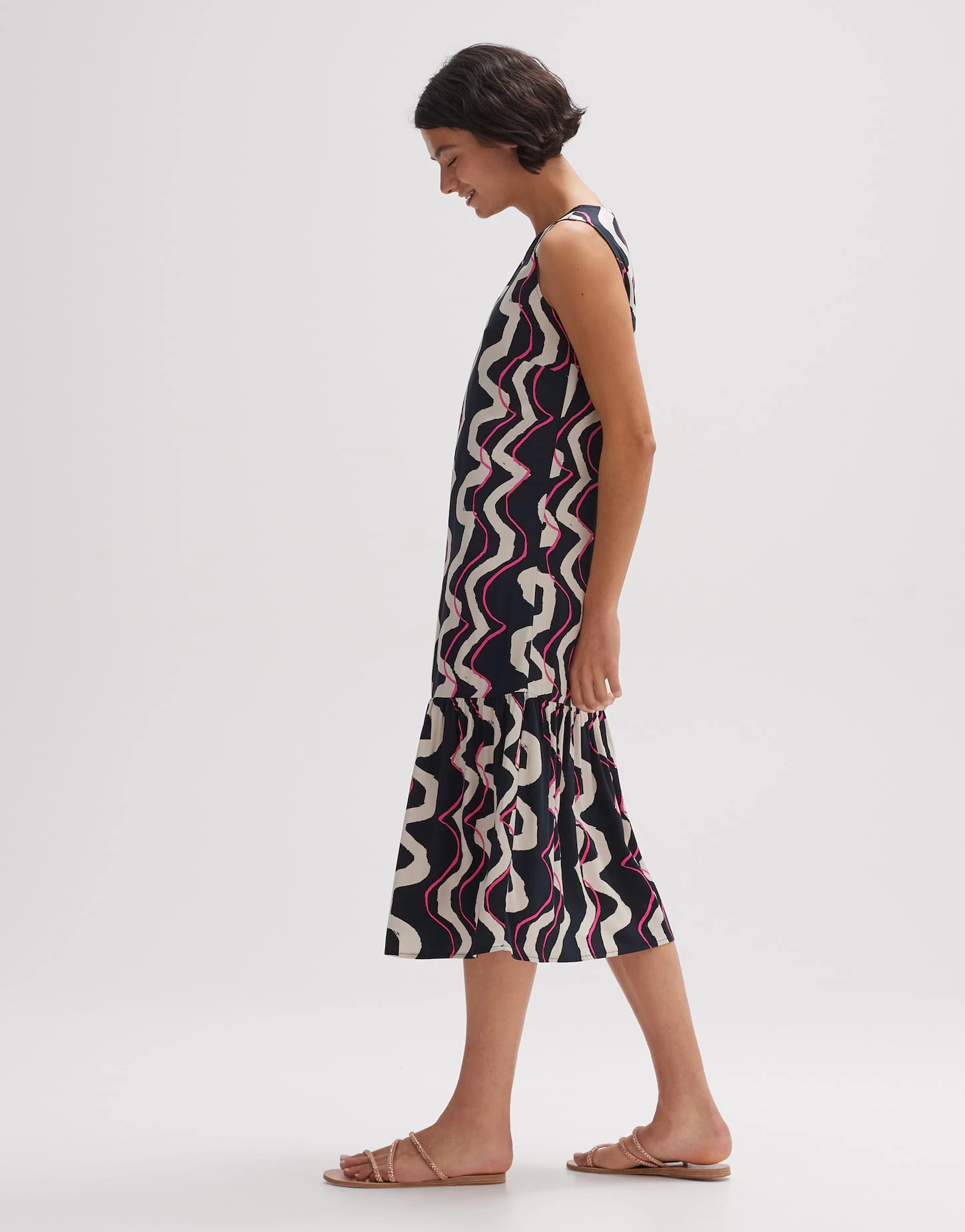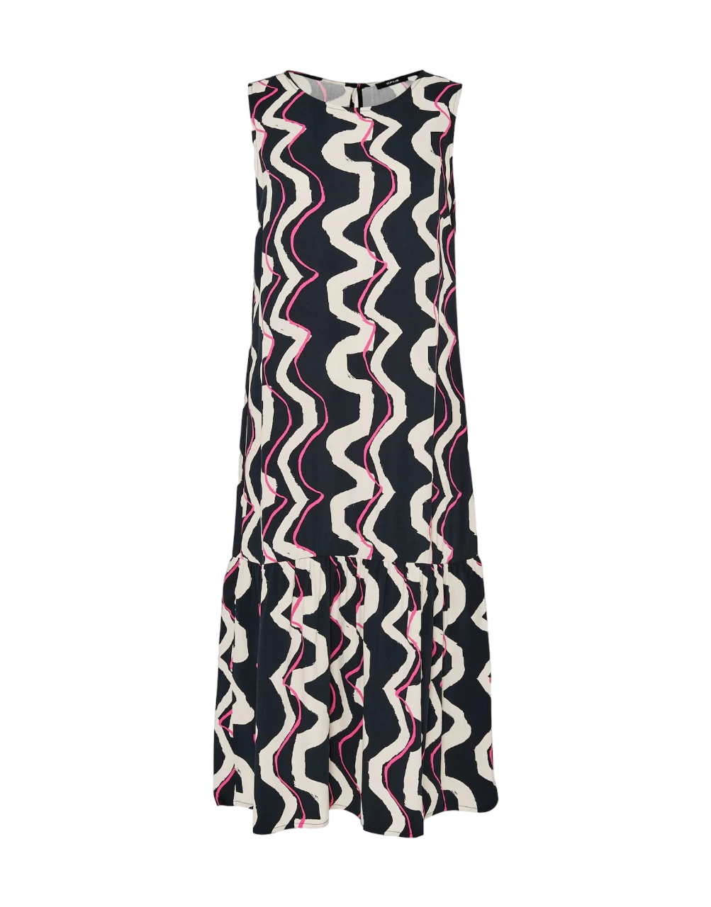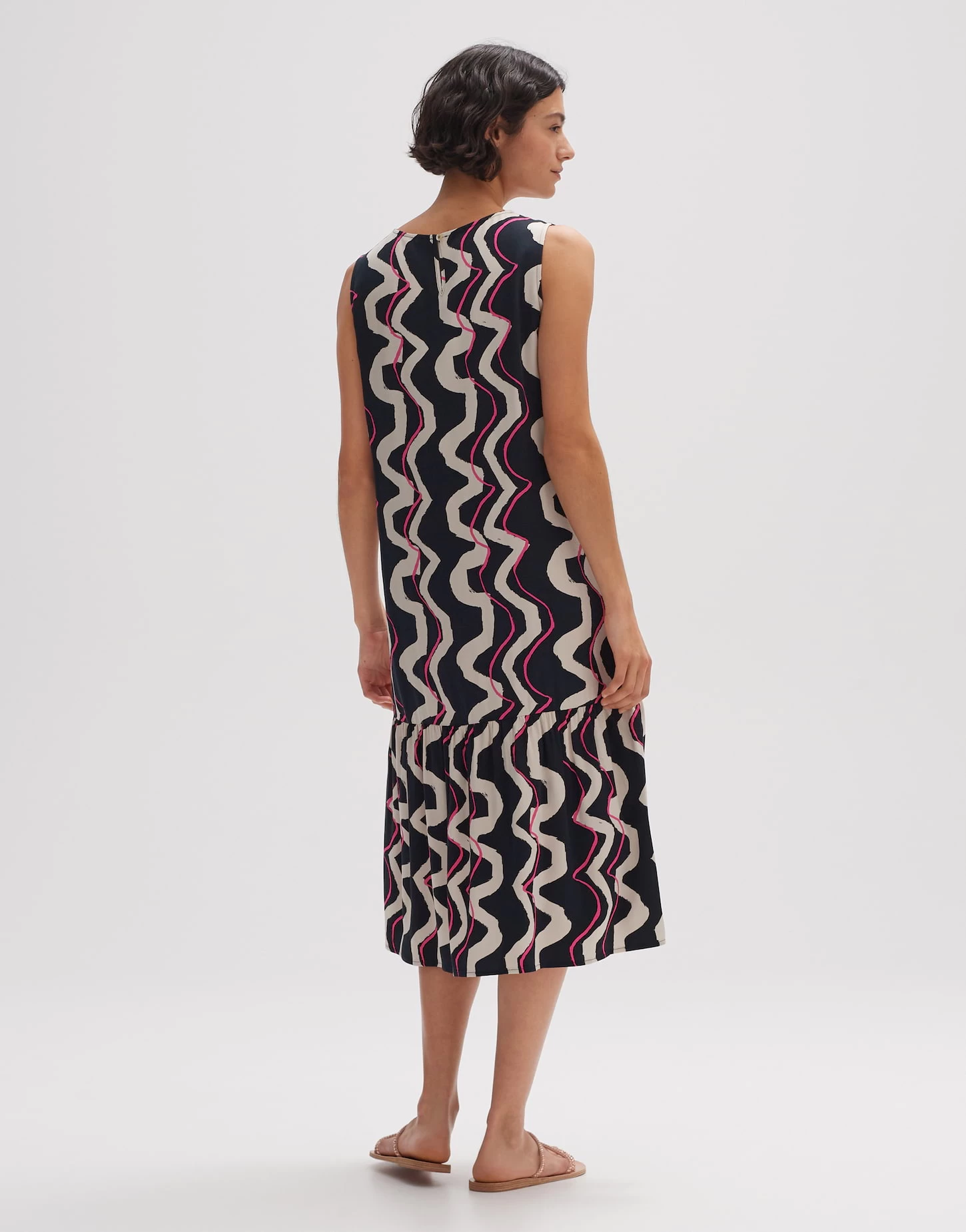 Das Printkleid aus fließender Viskose besticht mit einem wellenförmigen Print, der wie ein überdimensionaler Pinselstrich wirkt. Die ausgestellte Passform endet mit einem breiten Volant und reicht bis zur Wade.