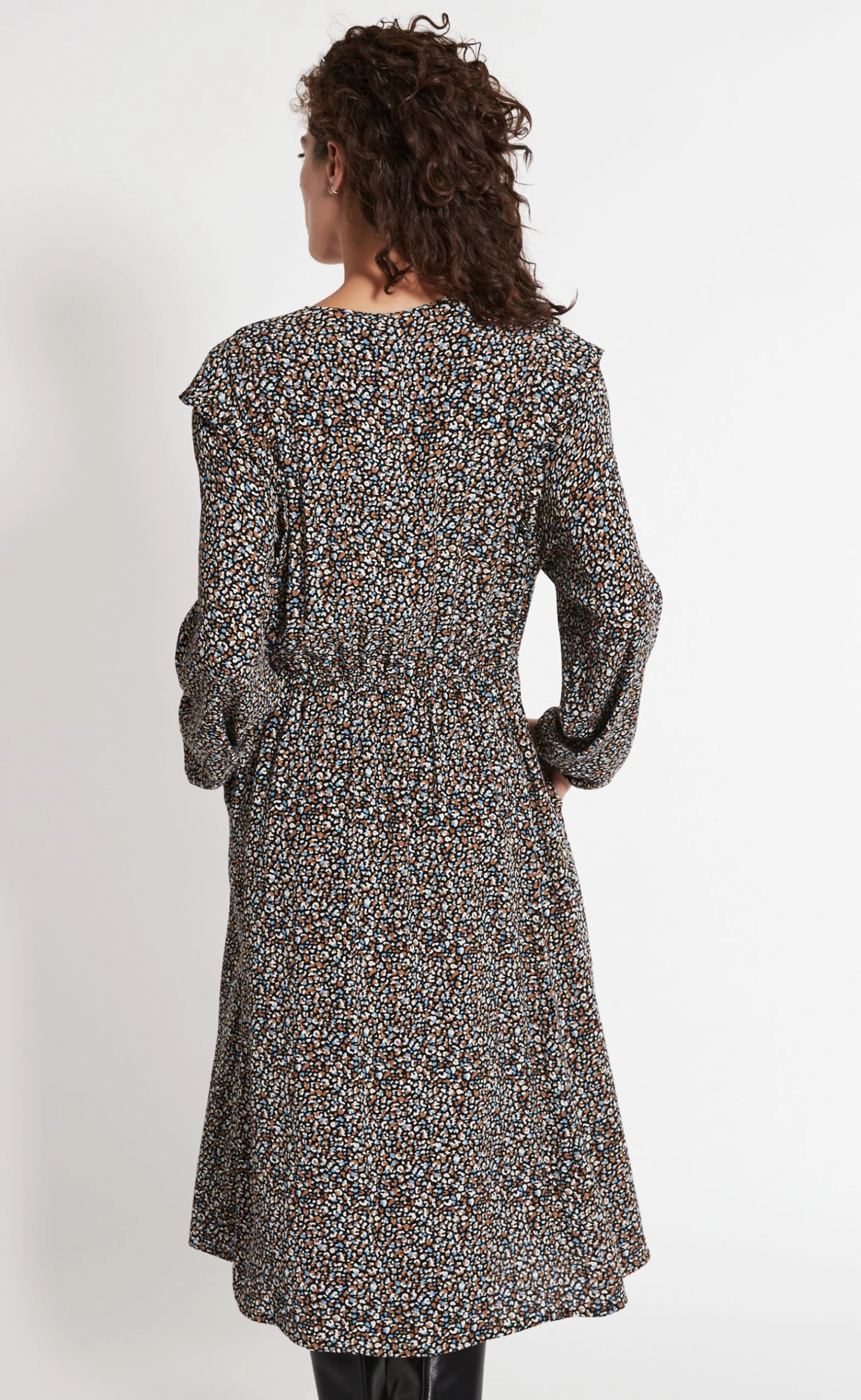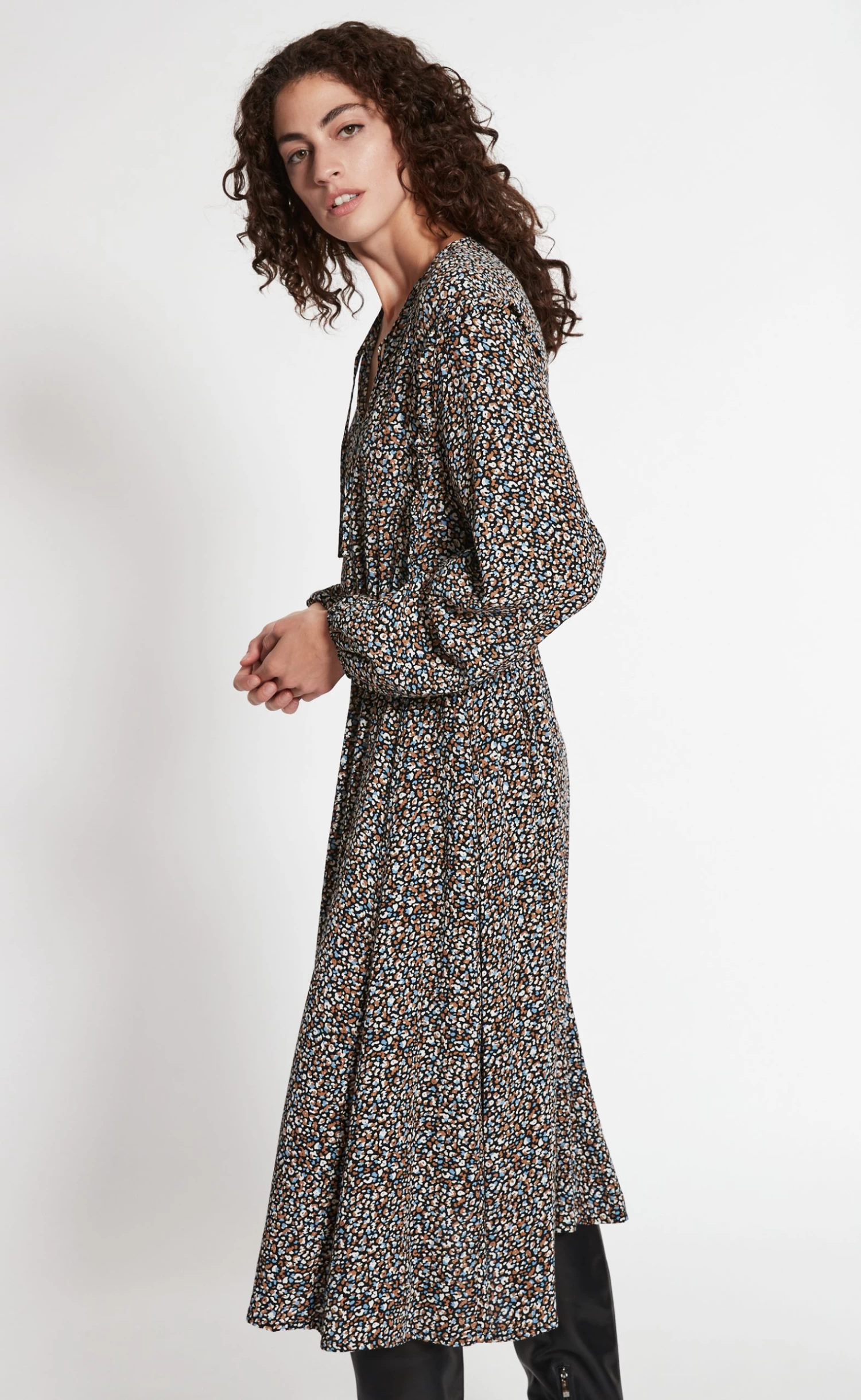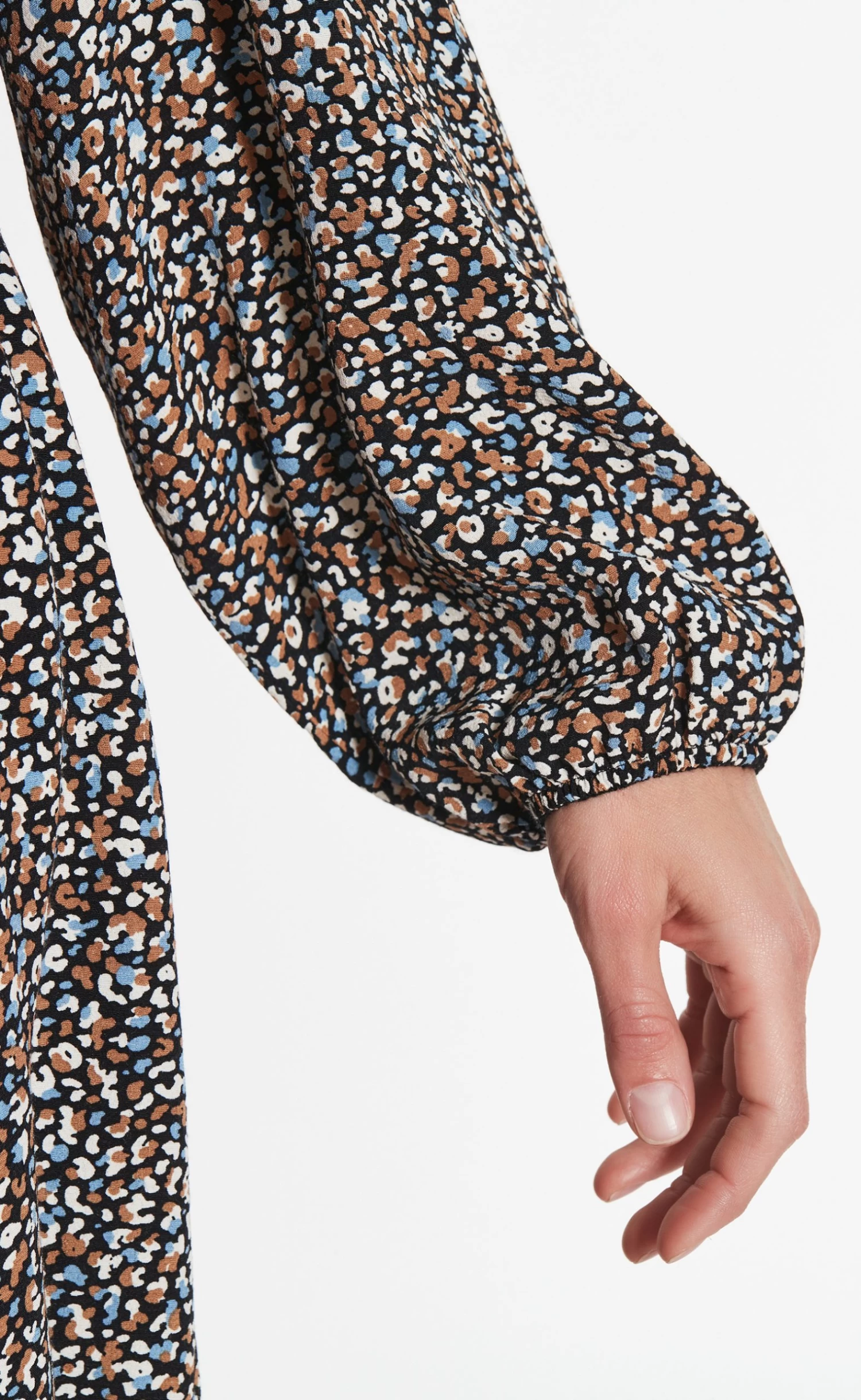 Bedrucktes Langarm Midi-Kleid mit Raffdetails an der Schulter und V-Ausschnitt mit Bändchen