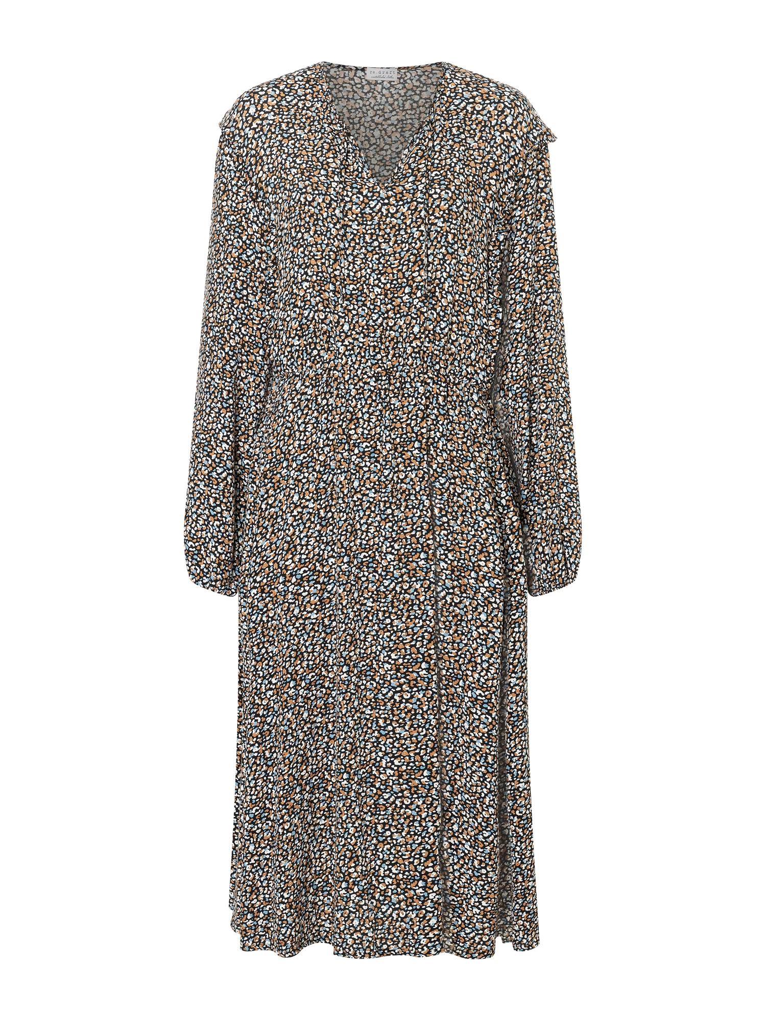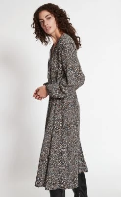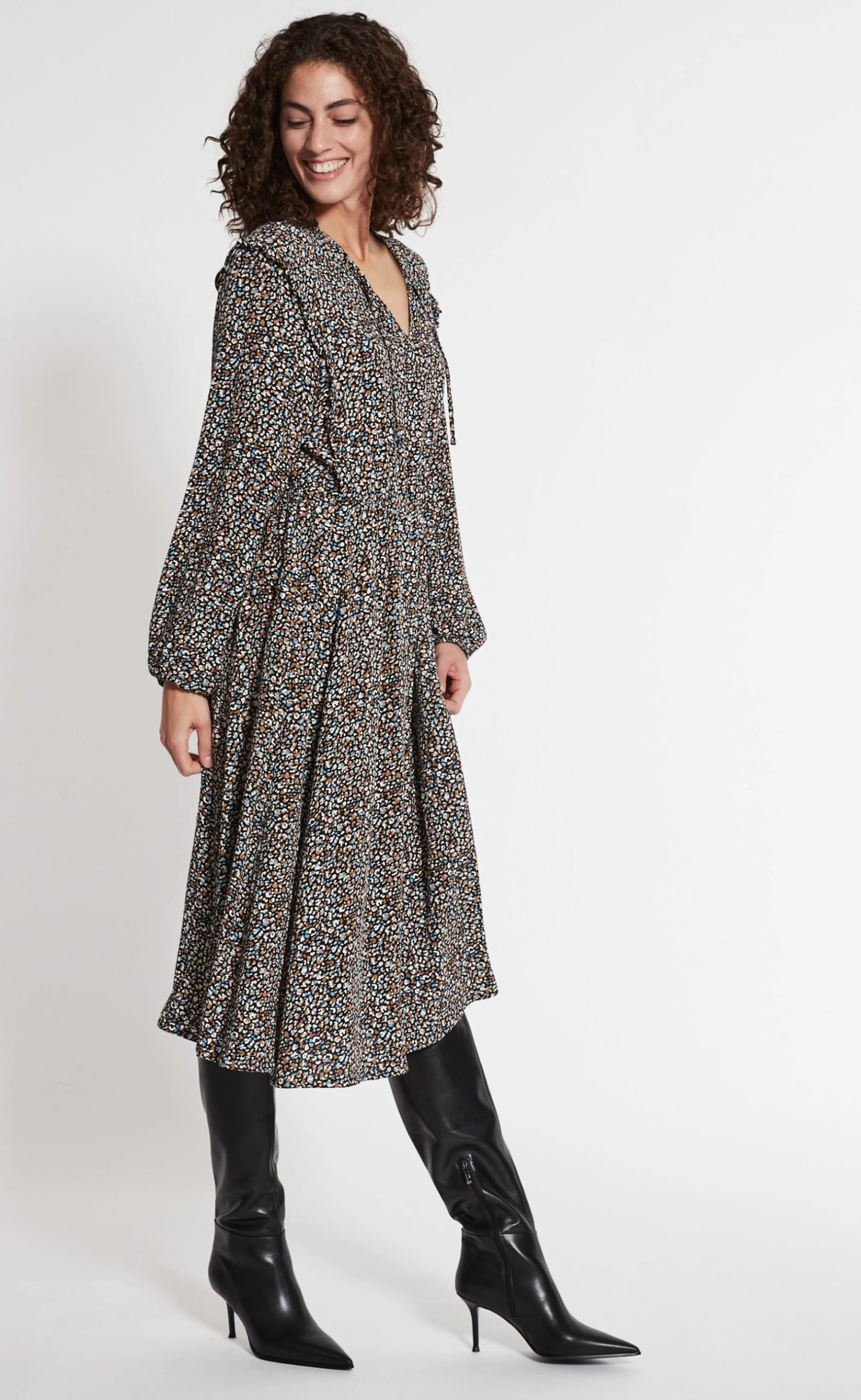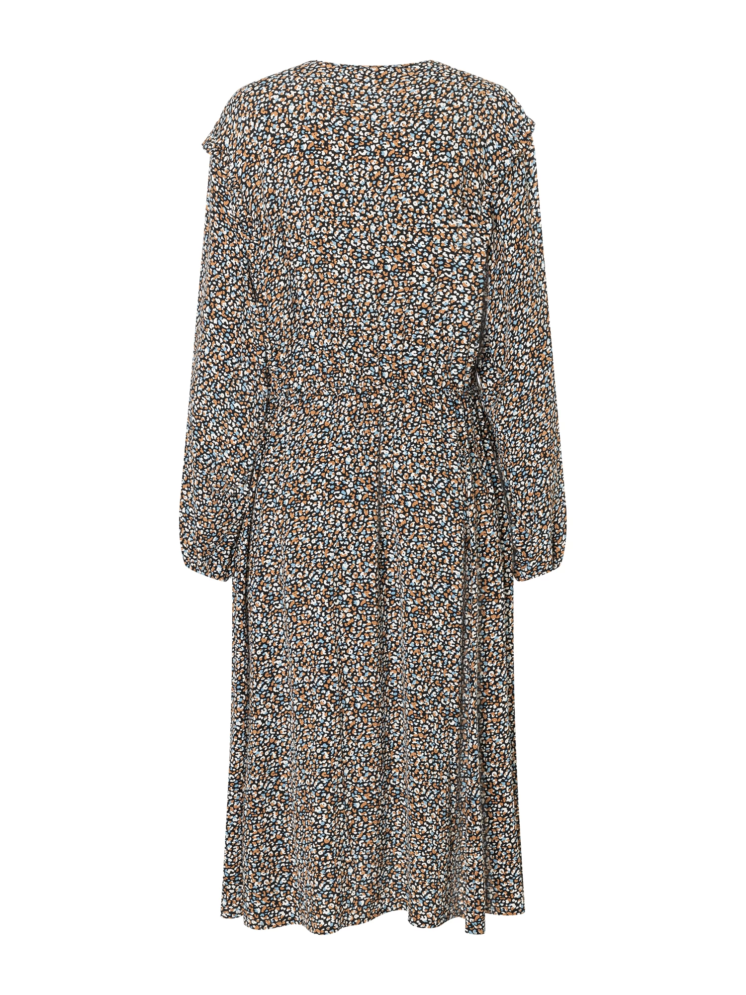 Bedrucktes Langarm Midi-Kleid mit Raffdetails an der Schulter und V-Ausschnitt mit Bändchen