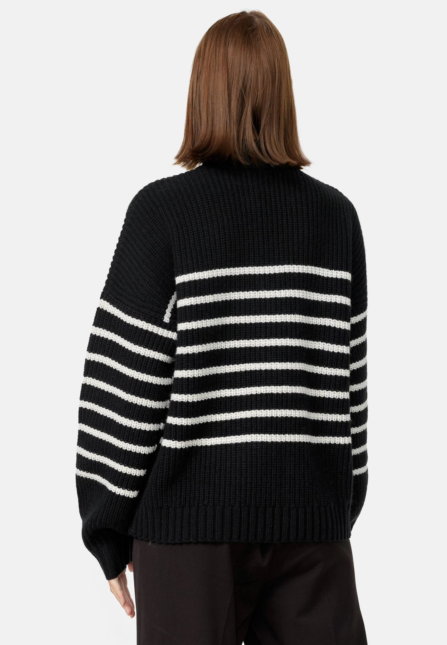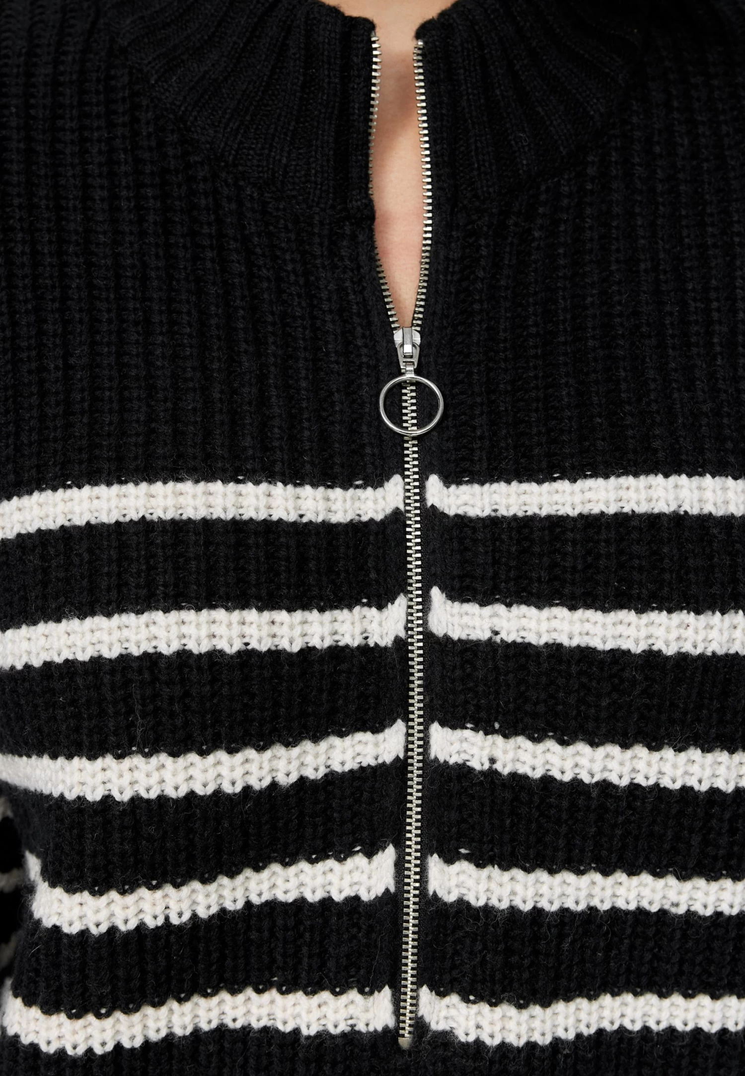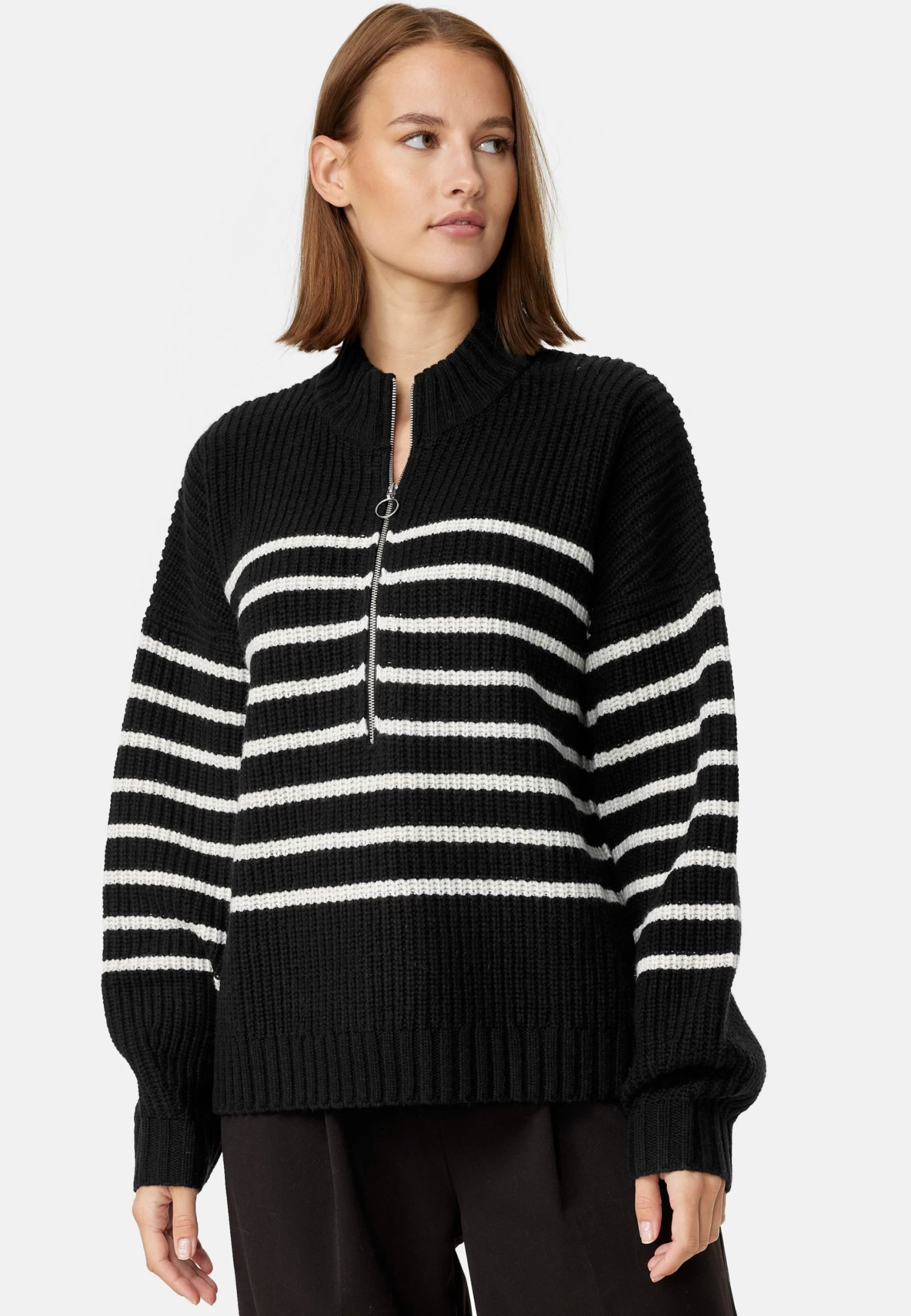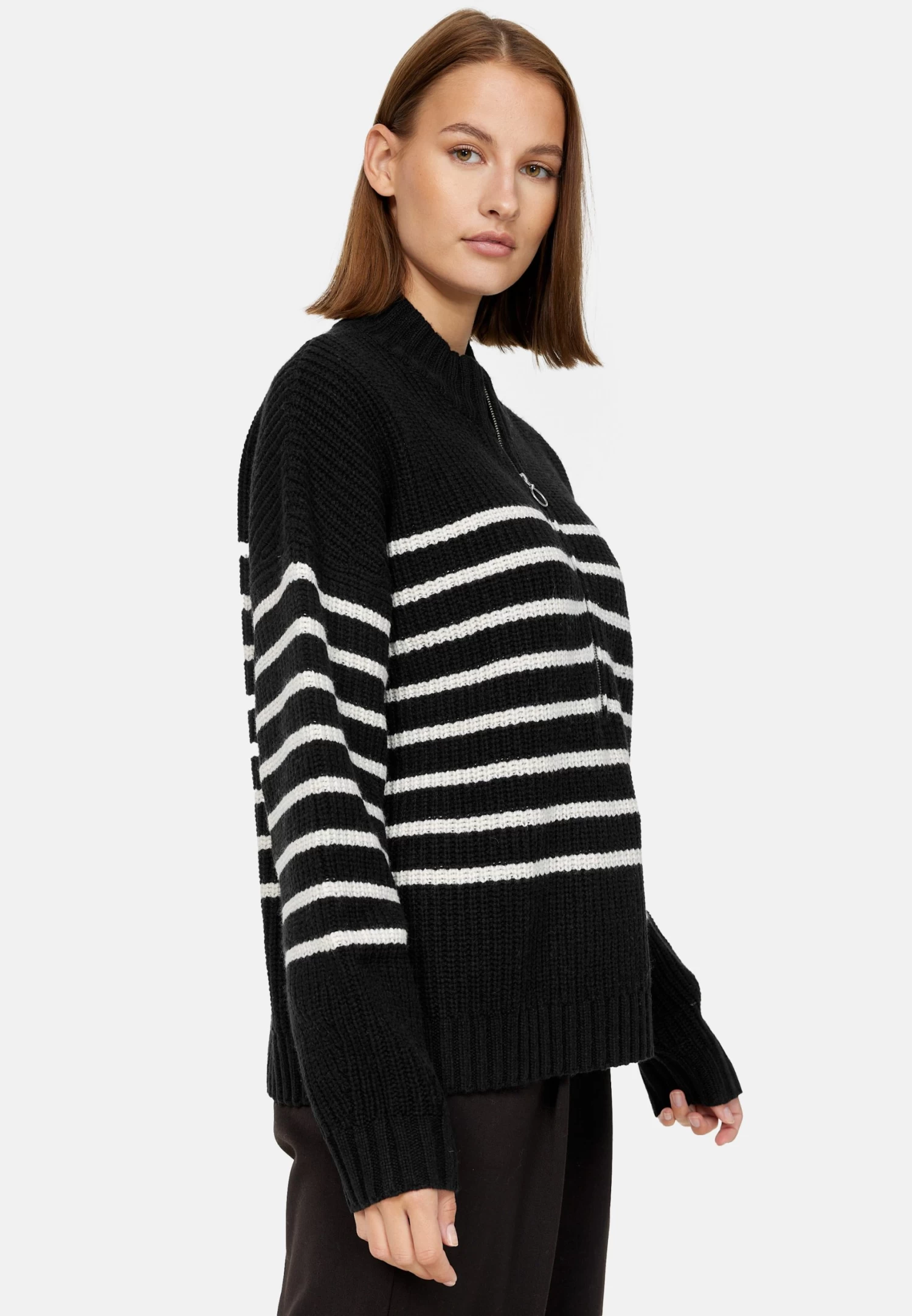 Gestreifter Pullover mit Rundhalsausschnitt und einem kurzen Reißverschluss in der vorderen Mitte. Ärmel und Saum sind mit einem Rippenabschluss versehen.