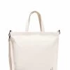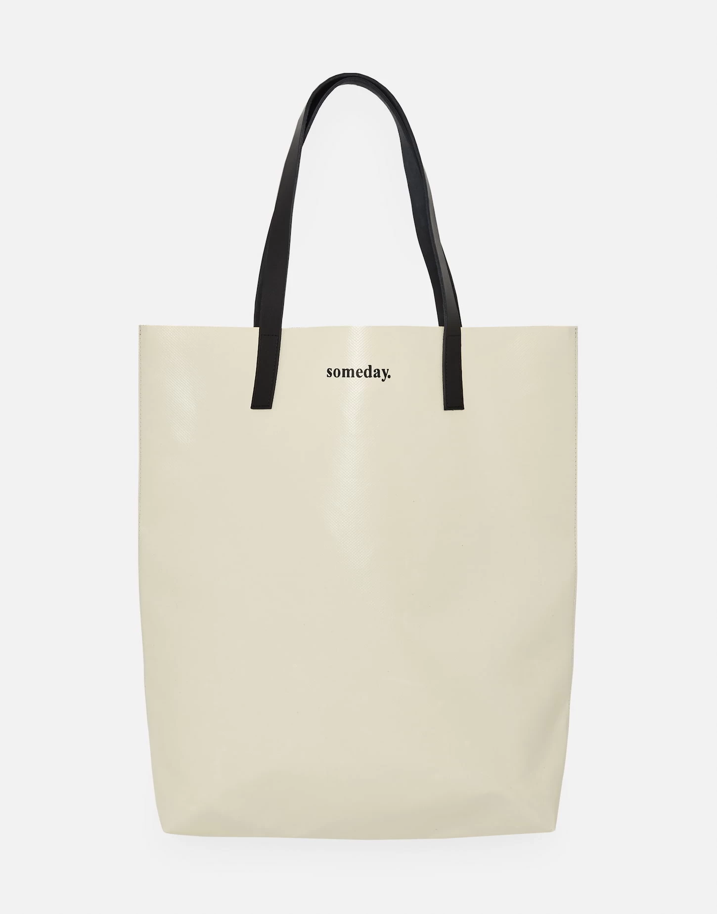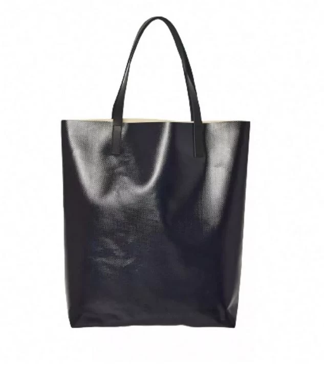 Der Shopper aus einer beschichteten Ware spielt mit einer kontrastreichen Zweifarbigkeit auf der Vorder- und Rückseite. Der Lederriemen setzt einen schönen weiteren Kontrast.