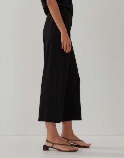 Gummibund hinten, dezente Crêpe-Optik, französische Taschen in den Seiten, weites, verkürztes Bein, Beininnenlänge ca. 60,5 cm bei Größe 36, das Model ist 178 cm groß und trägt Größe 36.