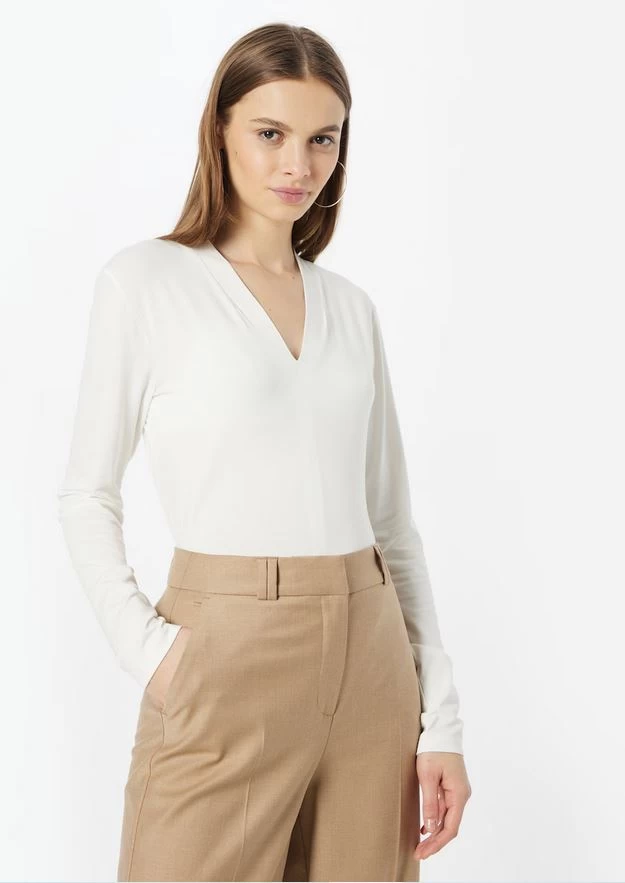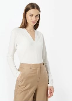 Das Shirt aus einem hochwertigen ECOVERO™ Viskose Mix ist durch die figurbetonte Passform ein perfekter Unterzieher. Die weichfallende Ware fühlt sich besonders angenehm an auf der Haut und der V-Ausschnitt sorgt für einen femininen Akzent.