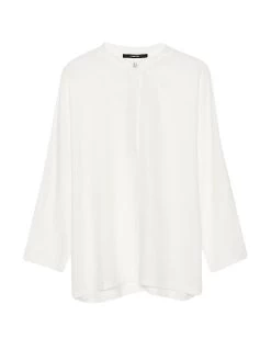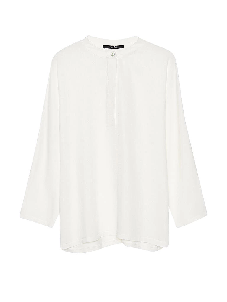 Das Shirt aus einem Material-Mix aus hochwertiger Viskose setzt auf eine lässige Passform mit überschnittenen Ärmeln. Die Front aus einer Webware bricht mit dem Rücken aus softem Jersey. Die mittellange Knopfreihe ist verdeckt und legt nur den obersten Perlmuttknopf frei.