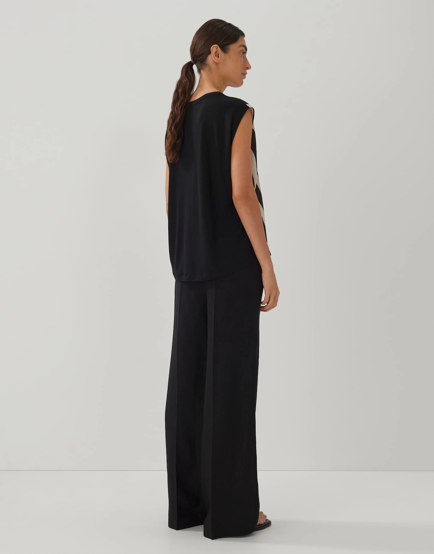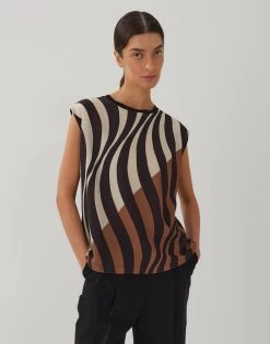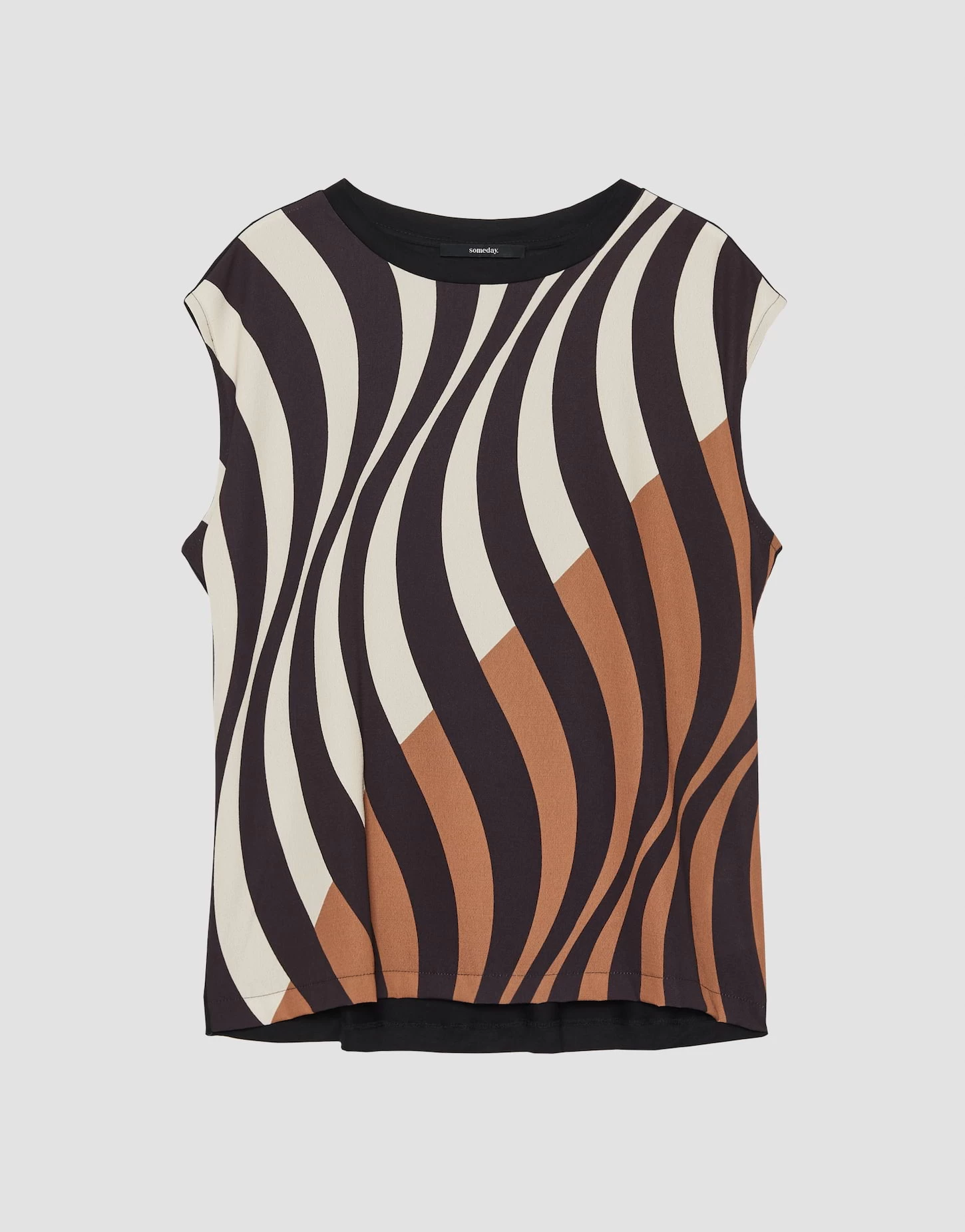 Das Printshirt spielt einen wellenförmigen Print in der Front über eine fließende Polyester-Ware. Der Rücken aus softem ECOVERO™ Viskose ist hingegen monochrom in der Farbigkeit.