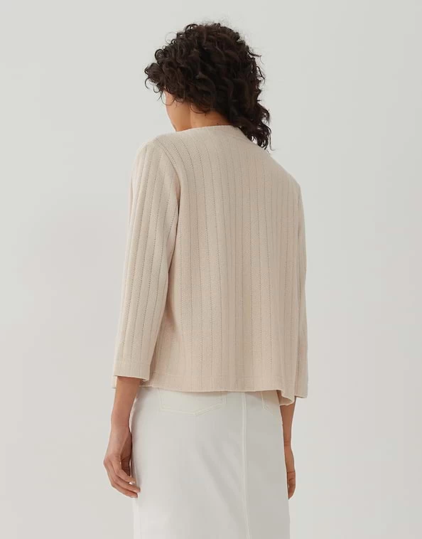 Die Shirtjacke aus einem ECOVERO™ Viskose Mix überzeugt mit schöner Ripp-Optik, die eine Art Streifen-Muster entstehen lässt. Die offene Front macht die Strickjacke zu einem lässigen Überwerfer.