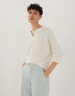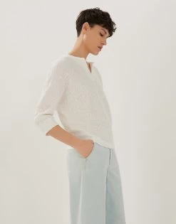 Das Shirt aus einem Baumwoll-Mix verfügt über einen schönen Crinkle-Effekt. Der Rundhalsausschnitt läuft auf der Front in einen kleinen V-Ausschnitt über. Die Oberfläche steht im Fokus, während die Passform entspannt gehalten ist.