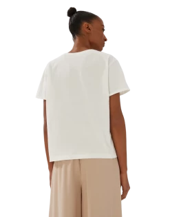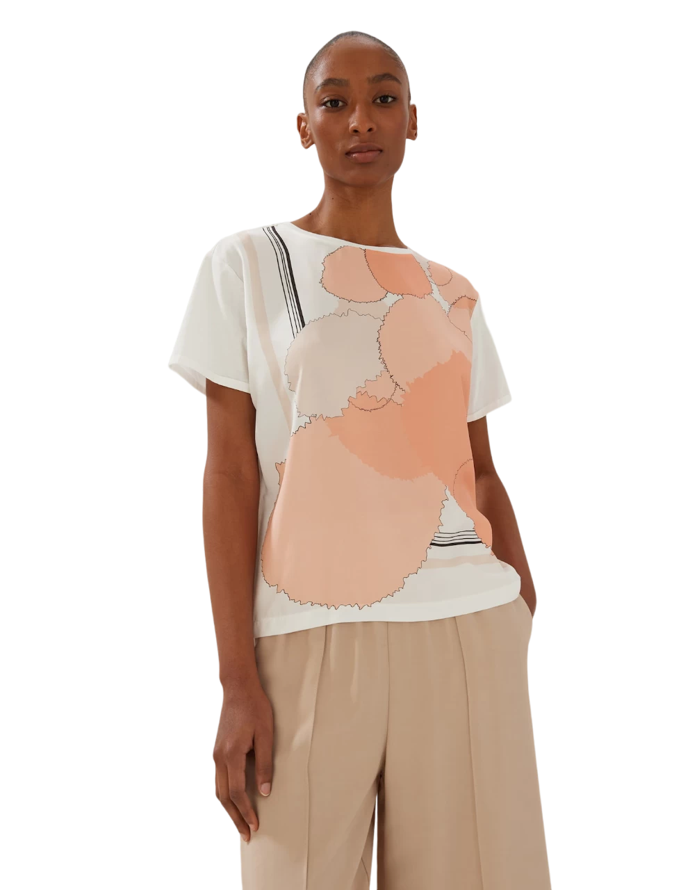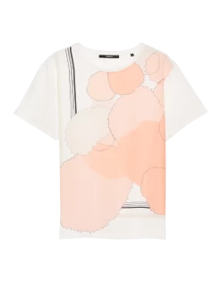 Das Print Shirt aus einem spannungsreichen Material-Mix verleiht einem Print aus großen Kreisen durch kontrastreiche Linien einen schönen Rahmen. Die Front wirkt so wie ein gerahmtes Kunstwerk.