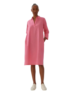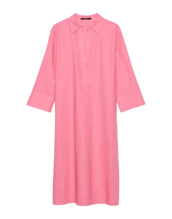 Das Blusenkleid aus einem hochwertigen BCI Cotton-Leinen-Mix ist in schmeichelnder Midi-Länge geschnitten. Schlitze in den Seiten lockern den klassischen Blusen Look auf. Auch der Ärmelsaum verfügt über einen raffinierten Schlitz.