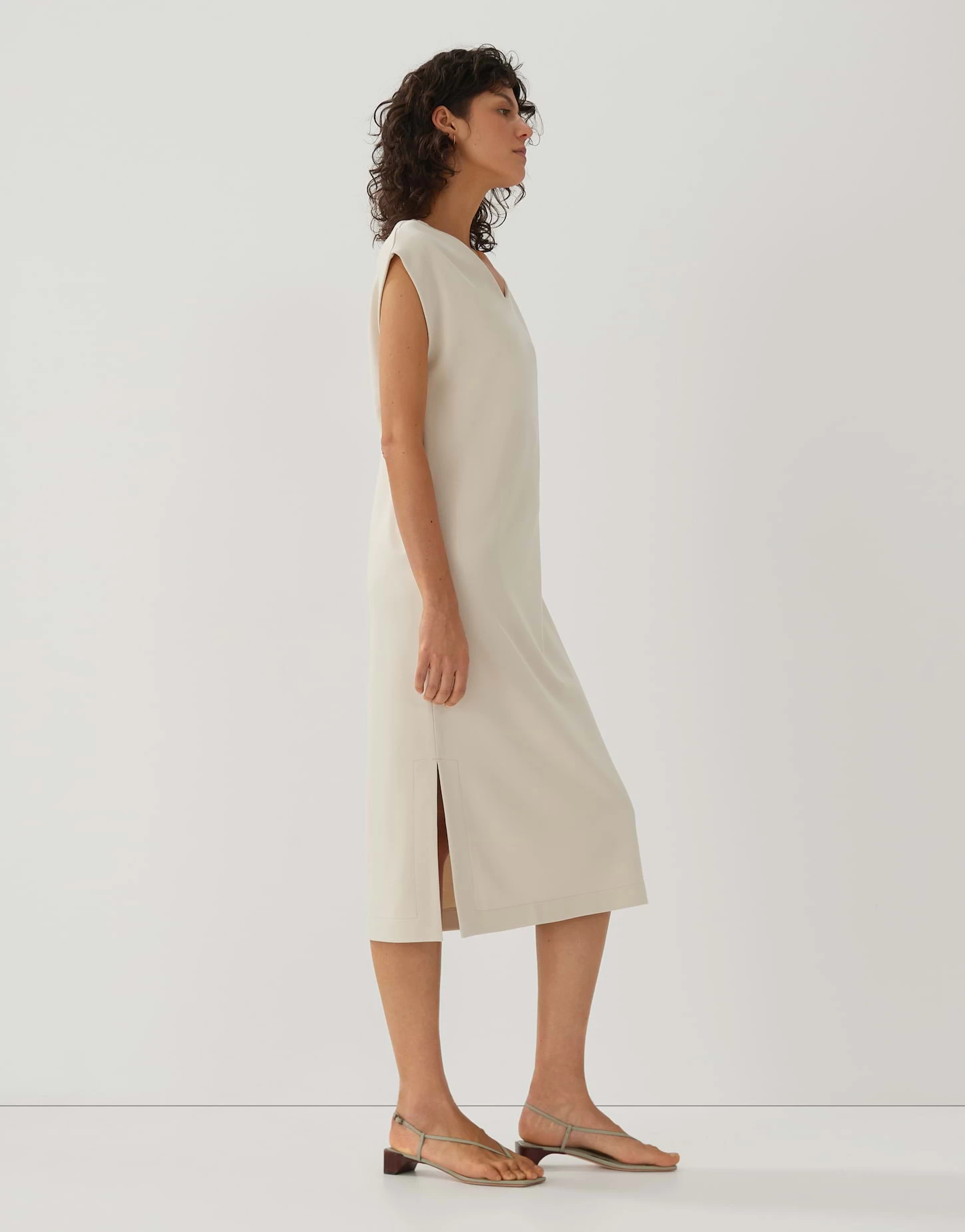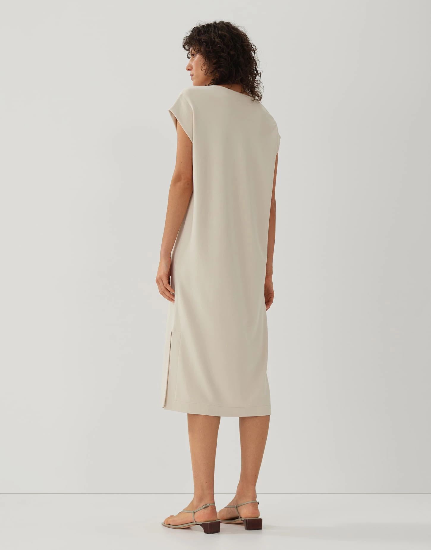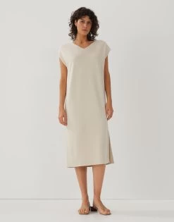Das Shirtkleid aus einem ECOVERO™ Viskose Mix steht für einen modernen, femininen Look. Die Form ist pur und kurz gehalten und wird durch einen hohen Schlitz in der Seite gebrochen.