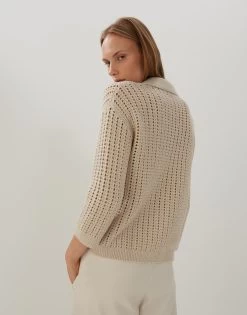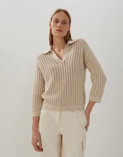 Der Strickpullover aus einem BCI Cotton Mix ist mit großer Masche im sogenannten Ajourstrick gefertigt. Der Ärmel ist verkürzt gehalten und ein klassischer Polokragen verleiht dem Pullover eine sportive Note.