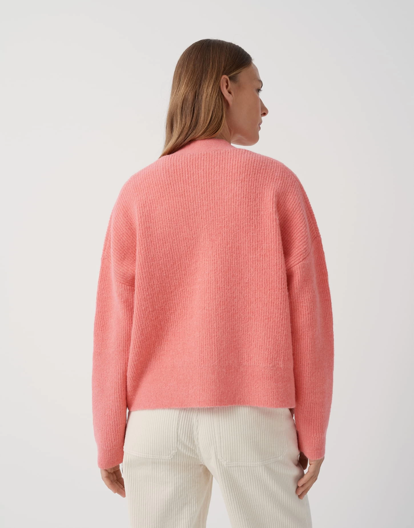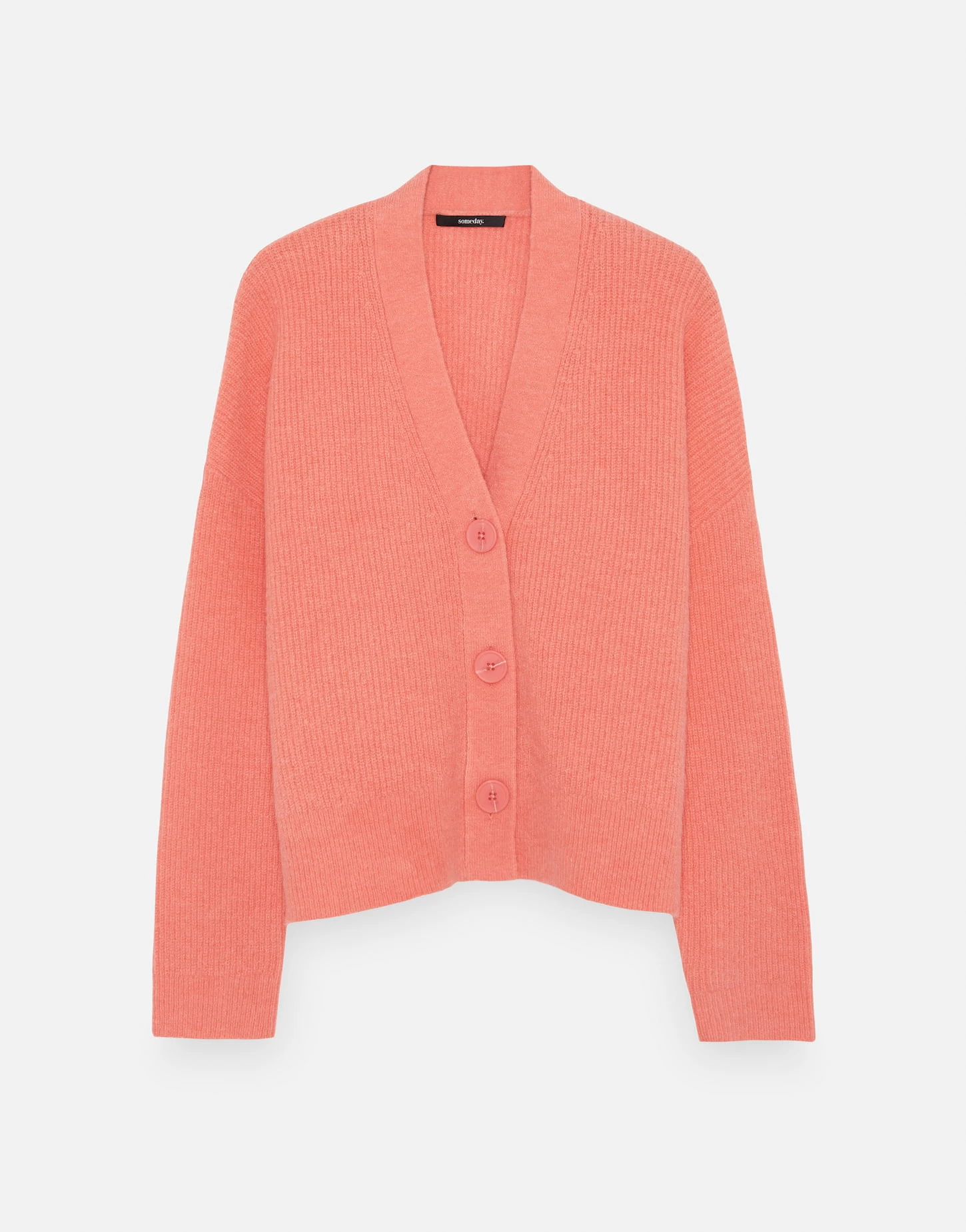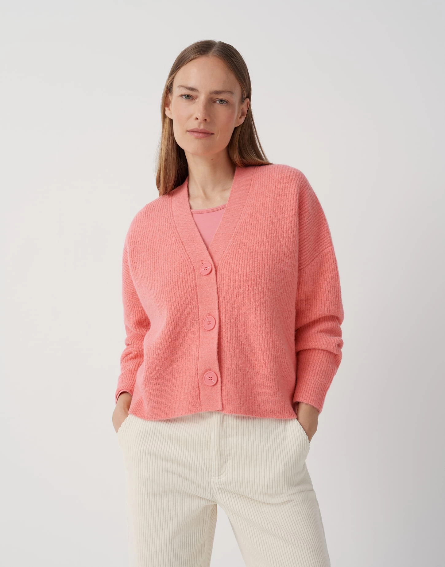 Die Strickjacke aus einem winterlichen Woll-Mix entpuppt sich als funktionaler und stilvoller Überzieher zu Kleidern und Shirts. Die natürliche Oberfläche harmoniert mit dem weiten Body und lädt zum Kuscheln ein. Große retro-anmutende Knöpfe runden den Look der Strickjacke ab.