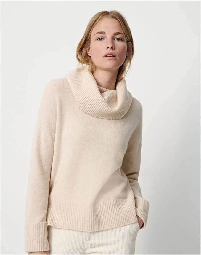 Der Rollkragenpullover besticht durch seine winterlichen Elemente: Der große, weite Kragen und die warme Woll-Mix-Qualität sorgen für Wärme und ein gutes Tragegefühl an kalten Wintertagen. Der Pullover ist locker geschnitten und besitzt Rippelemente am Saum und am Ärmel.