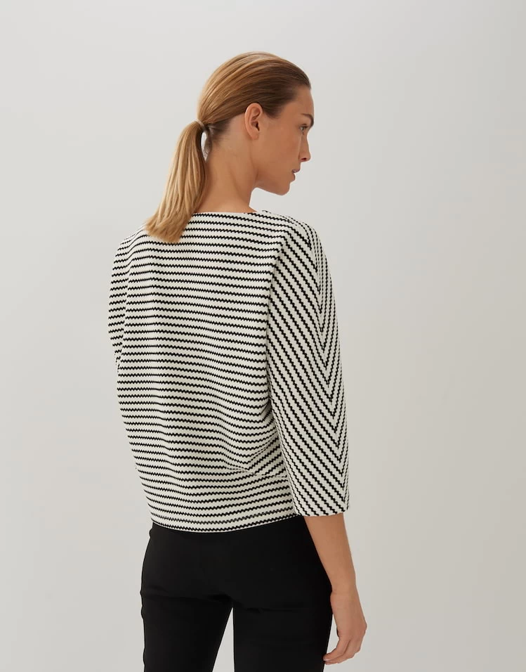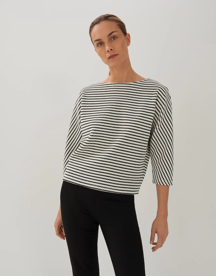 Der Sweater aus einem BCI Cotton Mix überzeugt mit einer neuen Streifen-Optik. Die texturierte Oberfläche wirkt dabei wie ein dynamisches Jacquard. Der Schnitt ist pur gehalten und mit Fledermausärmeln versehen.