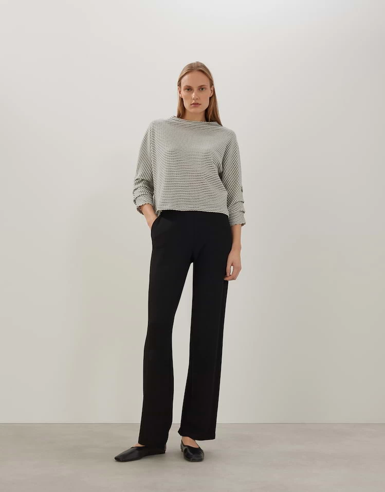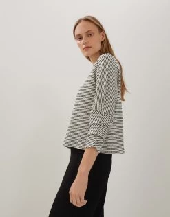 Der Sweater aus einem hochwertigen BCI Cotton Mix erhält durch die graphische Textur und Zweifarbigkeit eine dynamische Oberfläche. Die moderne Passform ist weit und kurz gehalten und mit überschnittenen Ärmeln versehen. Ein Stehkragen rundet den Look ab.