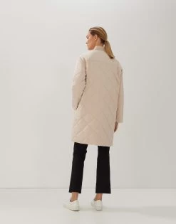 Der Mantel spielt ein modisches Rauten Steppmuster ĂĽber eine knielange, weite Passform. Der gerippte Jerseykragen verspricht ein sportliches Detail. Eine groĂźe Eingrifftasche auf der Brust und die Passe im RĂĽcken sind schlicht gehalten und brechen das Steppmuster.