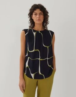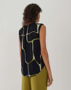 Das Blusentop aus hochwertiger Viskose lebt von einem organisch geformten Print. Durch die kleinen Raffungen am Rundhalsausschnitt erhält das Top einen fließenden Fall.