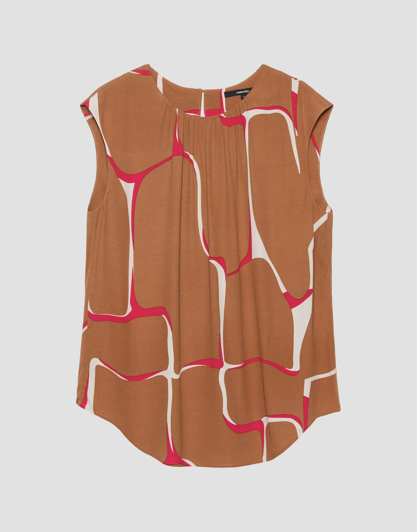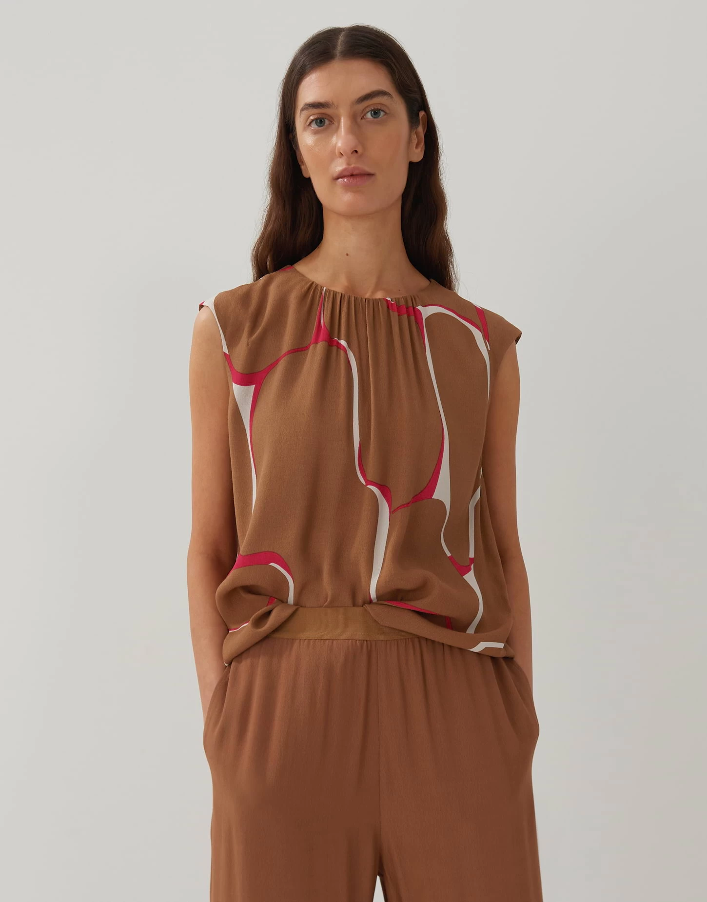 Das Blusentop aus hochwertiger Viskose lebt von einem organisch geformten Print. Durch die kleinen Raffungen am Rundhalsausschnitt erhält das Top einen fließenden Fall.