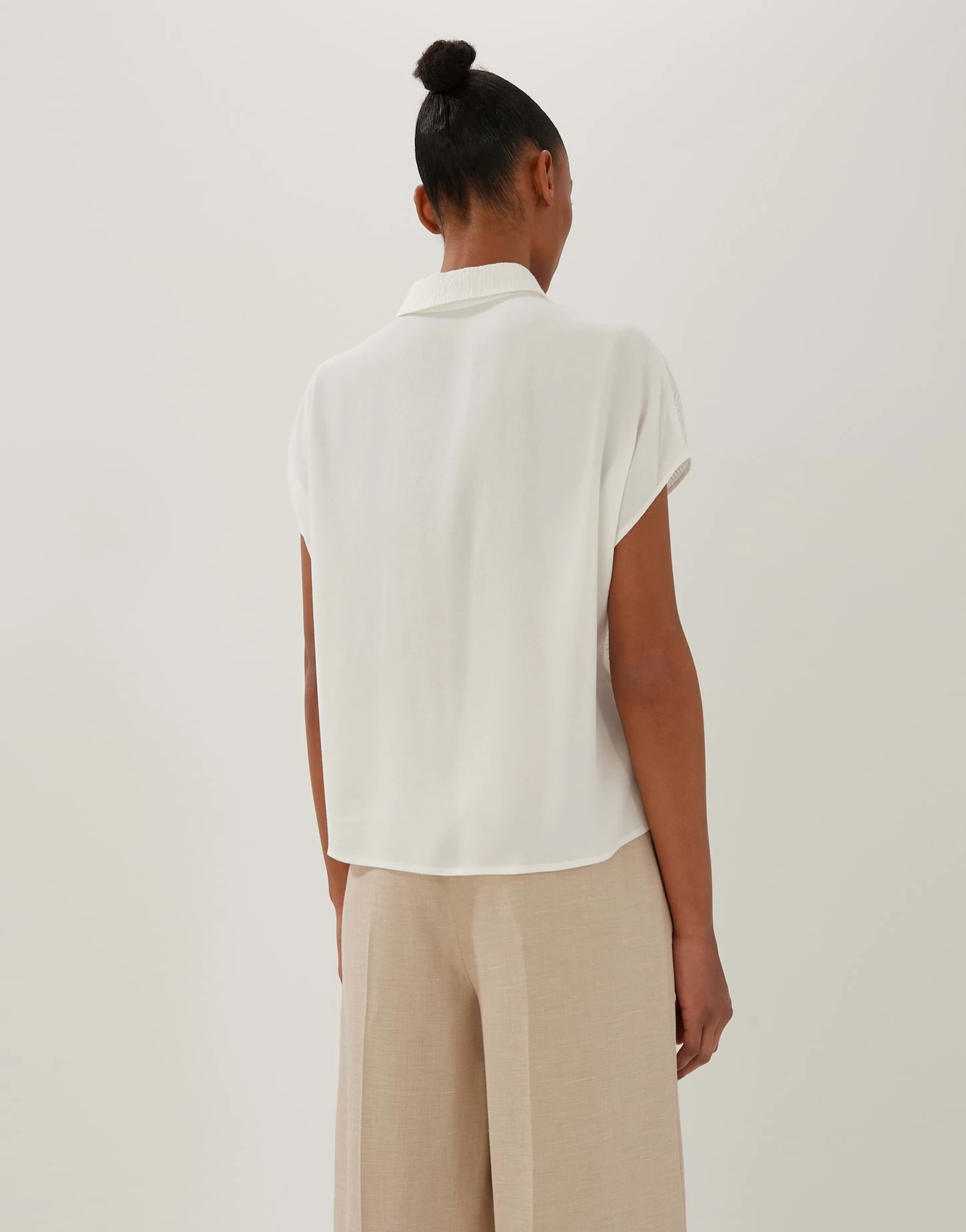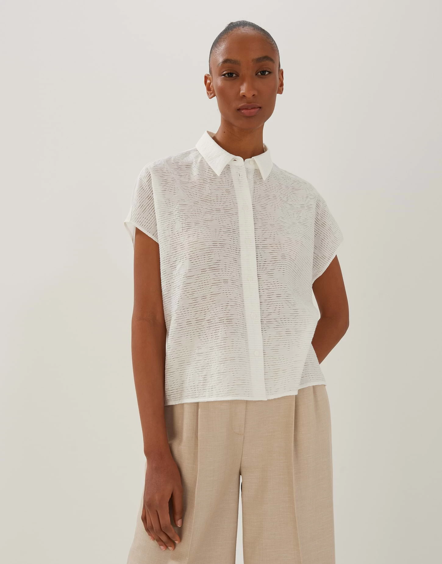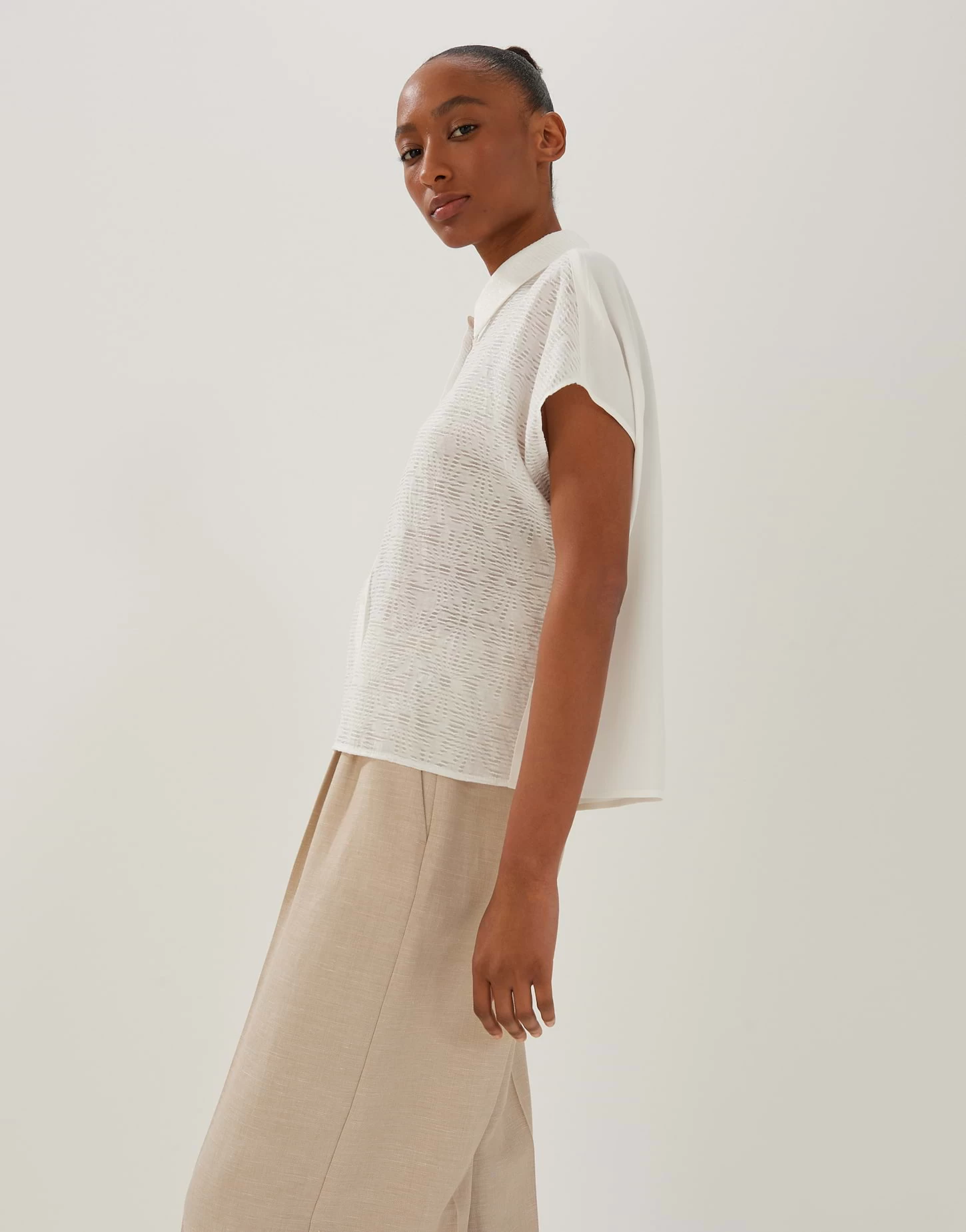 Die Printbluse aus einem spannungsreichen Material-Mix überzeugt mit einer dynamischen Front aus floraler Spitze. Die lässig Passform ist mit einem überschnittenem Kurzarm versehen. Der Rücken ist schlicht und aus ECOVERO™ Viskose.