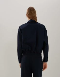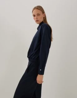 Die Bluse aus hochwertigem BCI Cotton wirkt wie ein Zusammenspiel aus klassischer Bluse und Blouson. Die weite Silhouette wird über ein Gummibündchen zusammengefasst. Durch die überschnittenen Schultern wirkt die Langarmbluse besonders lässig.