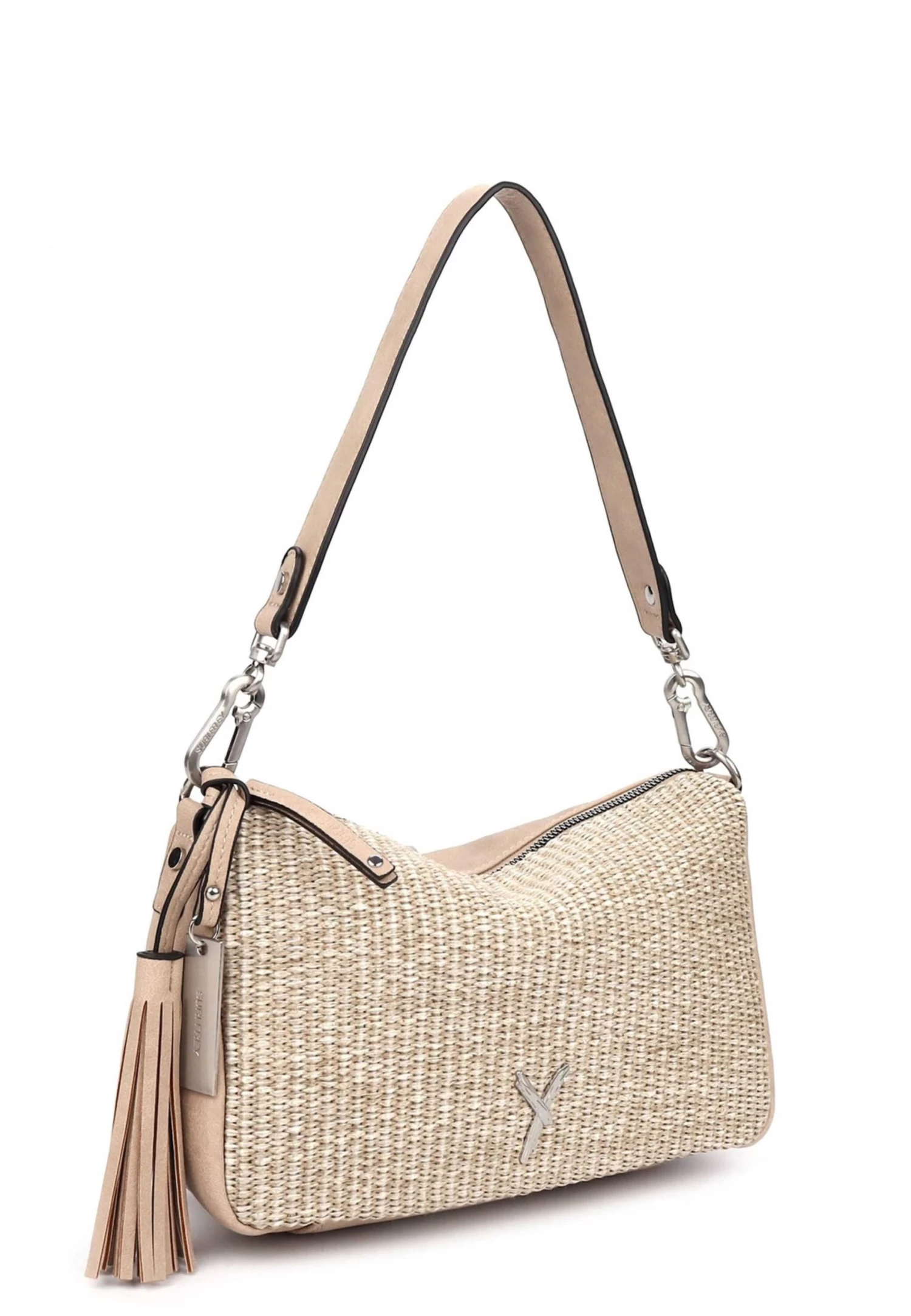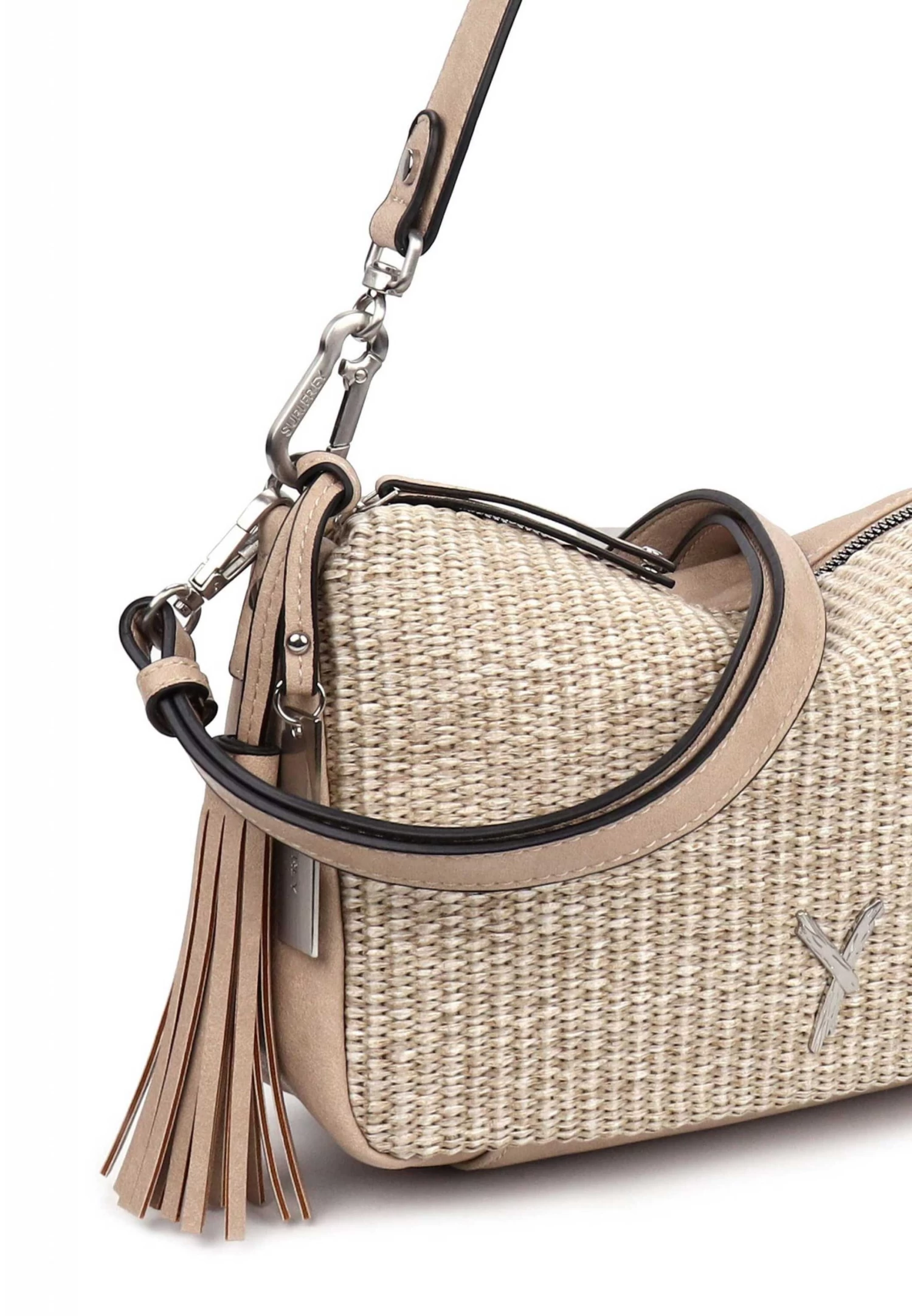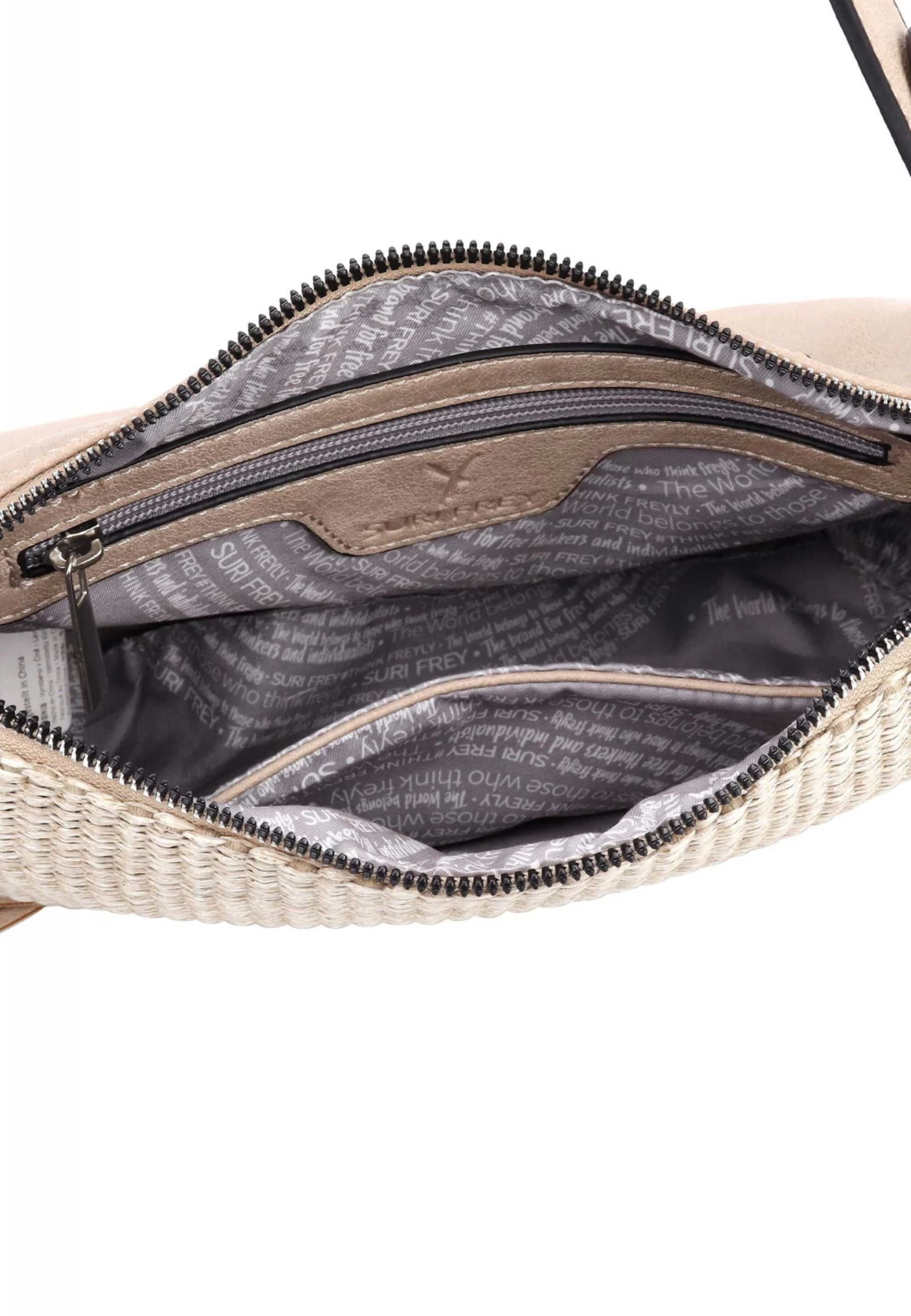 Eine Handtasche zeigt die Persönlichkeit einer Frau. Ob hundertpro geordnet oder leicht chaotisch – man muss sie einfach lieben! Die Umhängetasche Cassy kommt aus Feinsynthetik mit Reißverschluss und sieht einfach toll aus. Ob für Büro, Schule oder in der Freizeit – mit ihr lässt sich einfach jedes Abenteuer bestreiten. Gefertigt ist das Modell, das sich mit einem Reißverschluss verschließen lässt, aus Feinsynthetik. Durch das Material ist es angenehm im Griff. Die Bast-Optik und der Material-Mix sind fein gearbeitet und verleihen der Umhängetasche einen edlen Look. Selbstbewusst und „frey“ – SURI FREY SURI FREY kennt die Wünsche ihrer begeisterten Kundinnen genau und sie weiß, was sie verbindet – Lebensfreude und Freundschaft. Und genau das spiegeln die Produkte des angesagten Modelabels wider. Ordnung ist das halbe Leben. Ein übersichtliches Hauptfach sind in der Tasche integriert. Das Reißverschluss-Fach auf der Rückseite ist optimal, um extra Stauraum zu bieten und Dinge einfach griffbereit zu haben. Für alle, die eine weiche Haptik lieben – Cassy ist angenehm anschmiegsam. Ein Logo-Anhänger schmückt optisch und hebt den einzigartigen Look dieses neuen Favoriten hervor. Über der Schulter ist dieses Modell dem Tragegriff zu tragen.